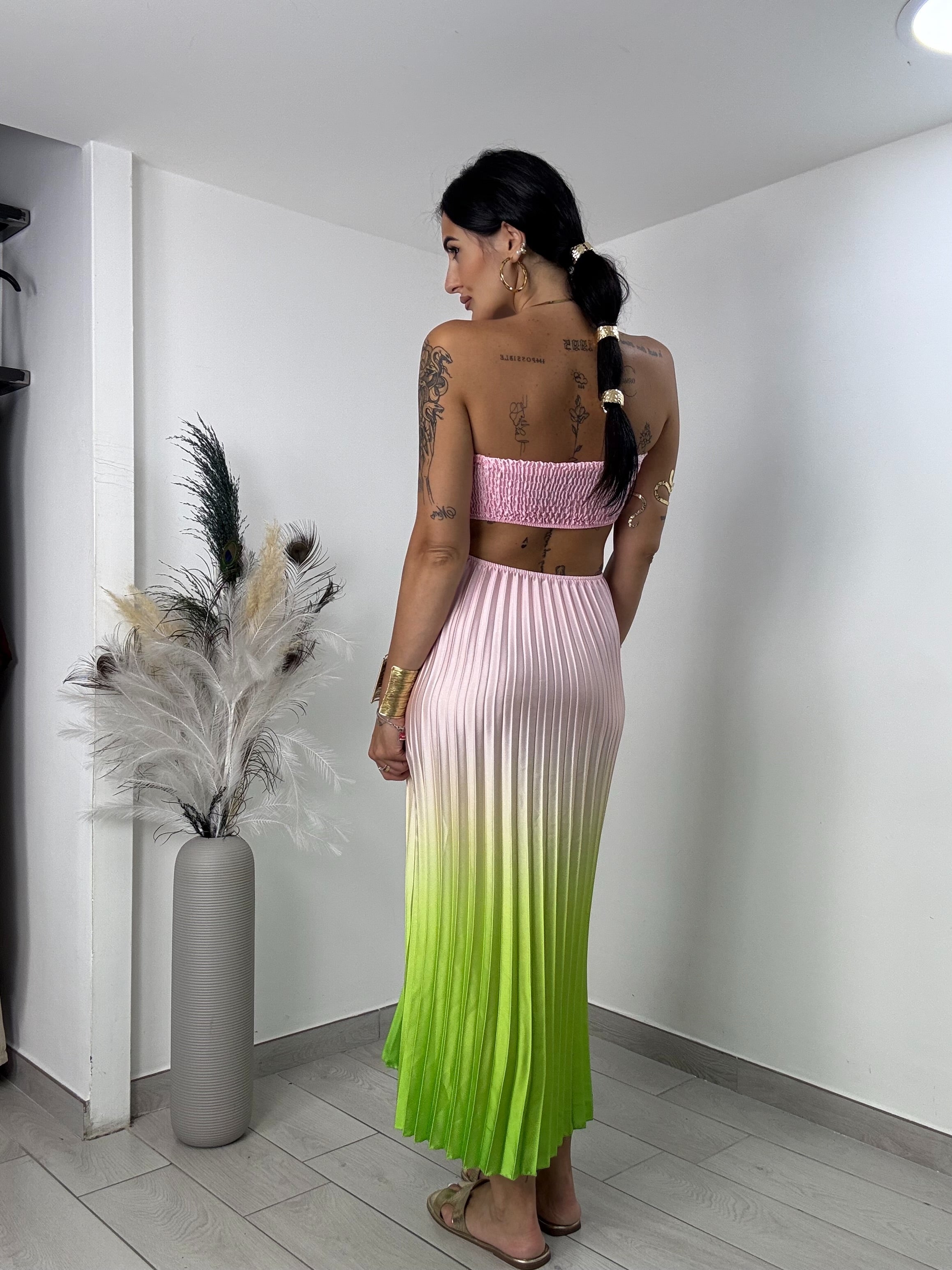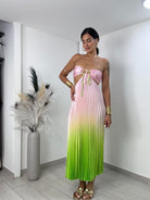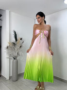Abito plissettato, potete legare i lacetti al collo , oppure metterlo a fascia , con elastico tubolare sul retro taglia unica vestibilità consigliata da una S ad una L