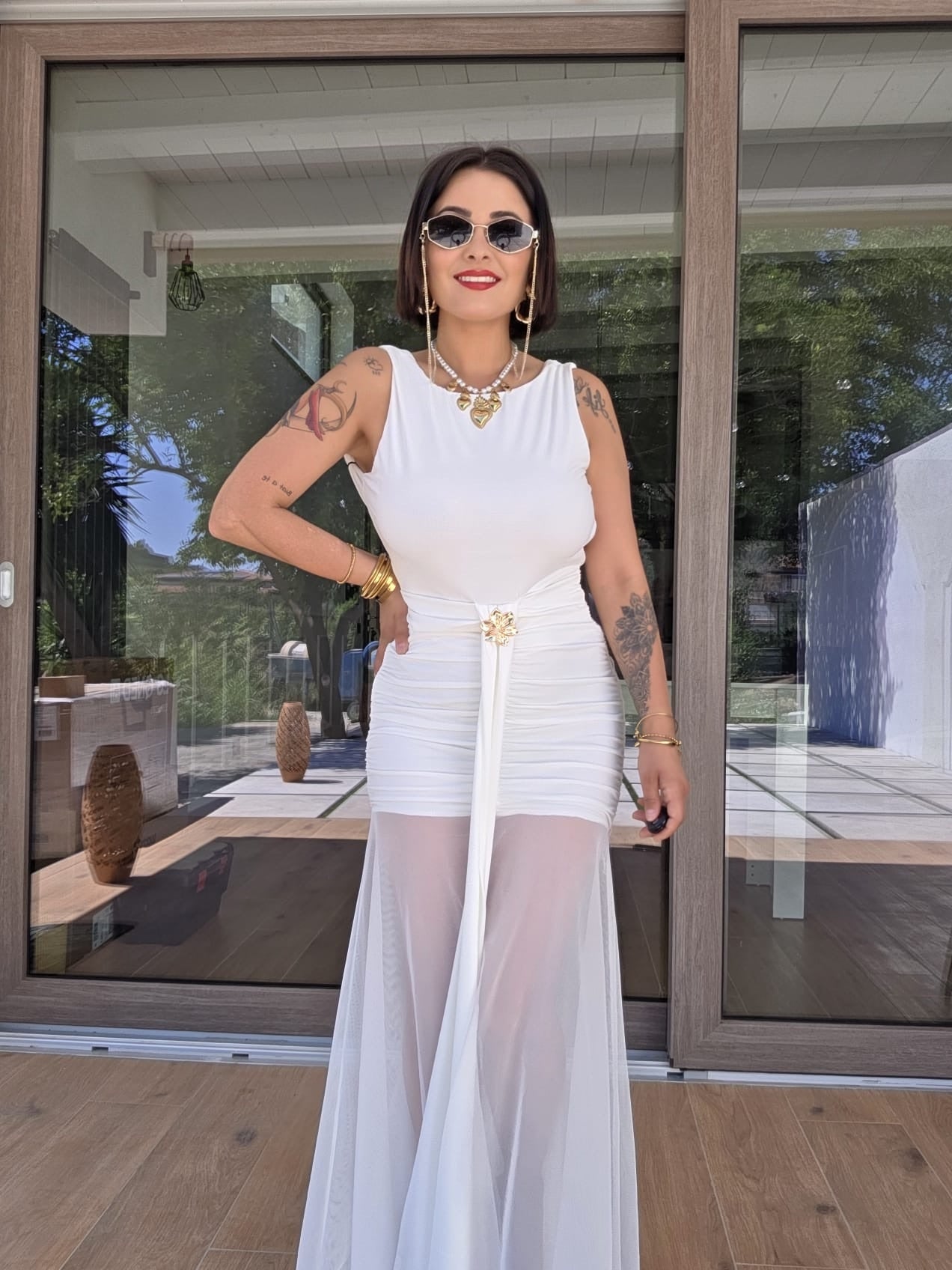 Abito in lycra , e velo , scollo sul retro , drappeggiato , taglia unica vestibilità consigliata da una S ad una L