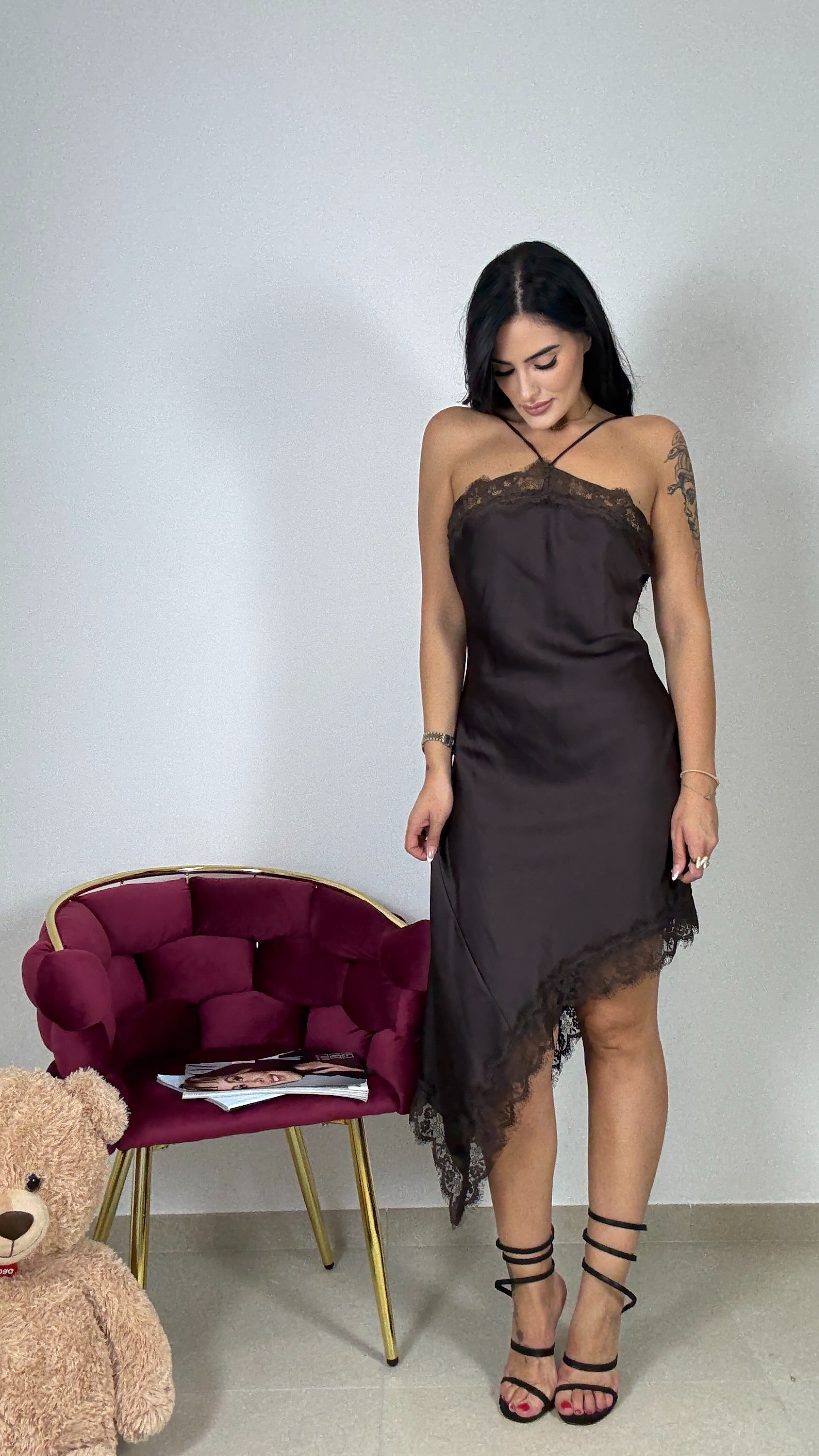 Abito in satin , scollo sul retro , asimmetrico, taglia unica vestibilità consigliata da una S ad una L