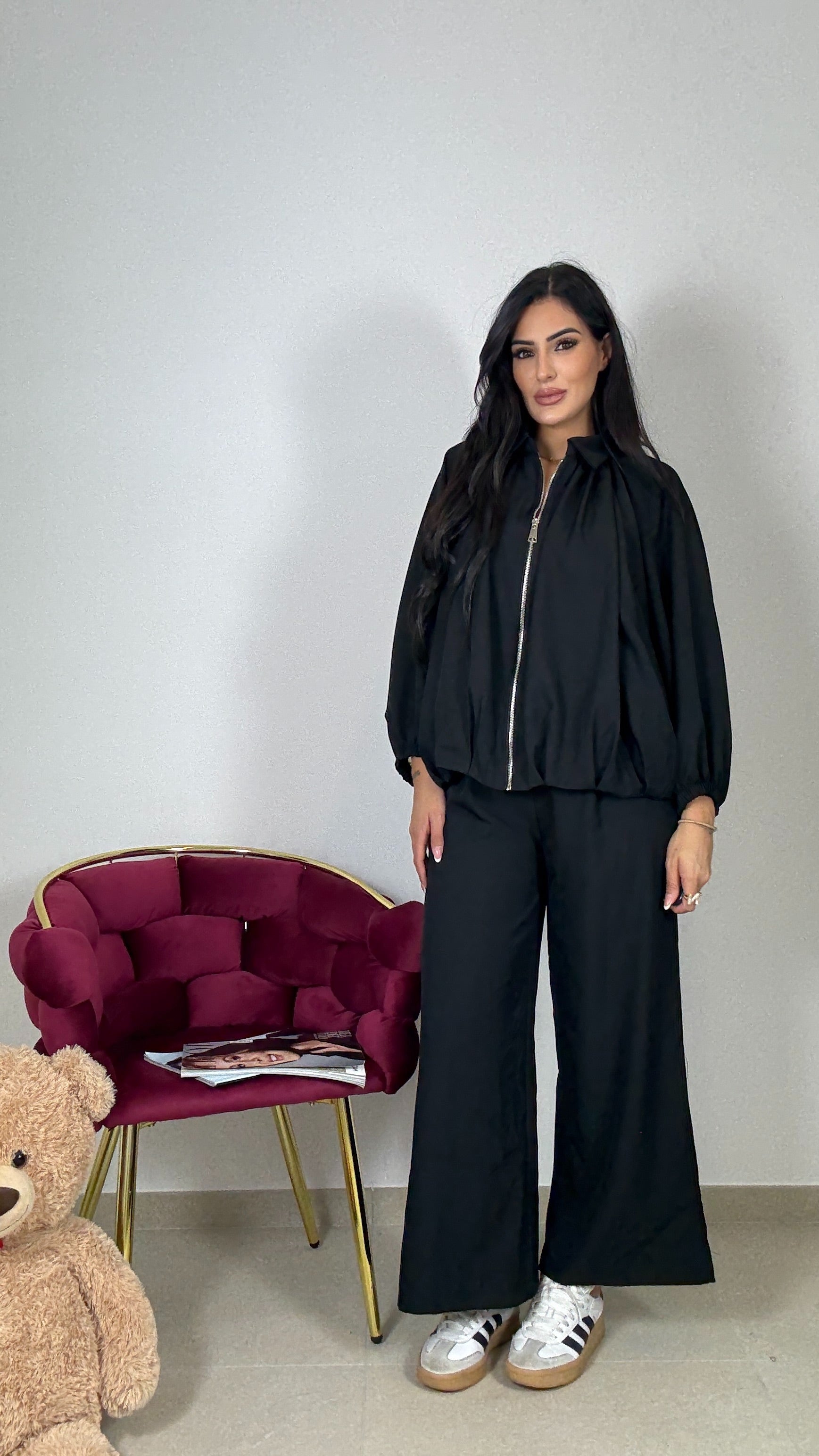 Coordinato , vi arriveranno a casa due pezzi , felpa modello ballons con zip , pantalone a palazzo , con molla in vita, taglia unica vestibilità consigliata da una S ad una L