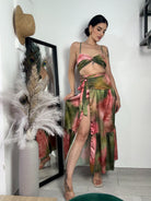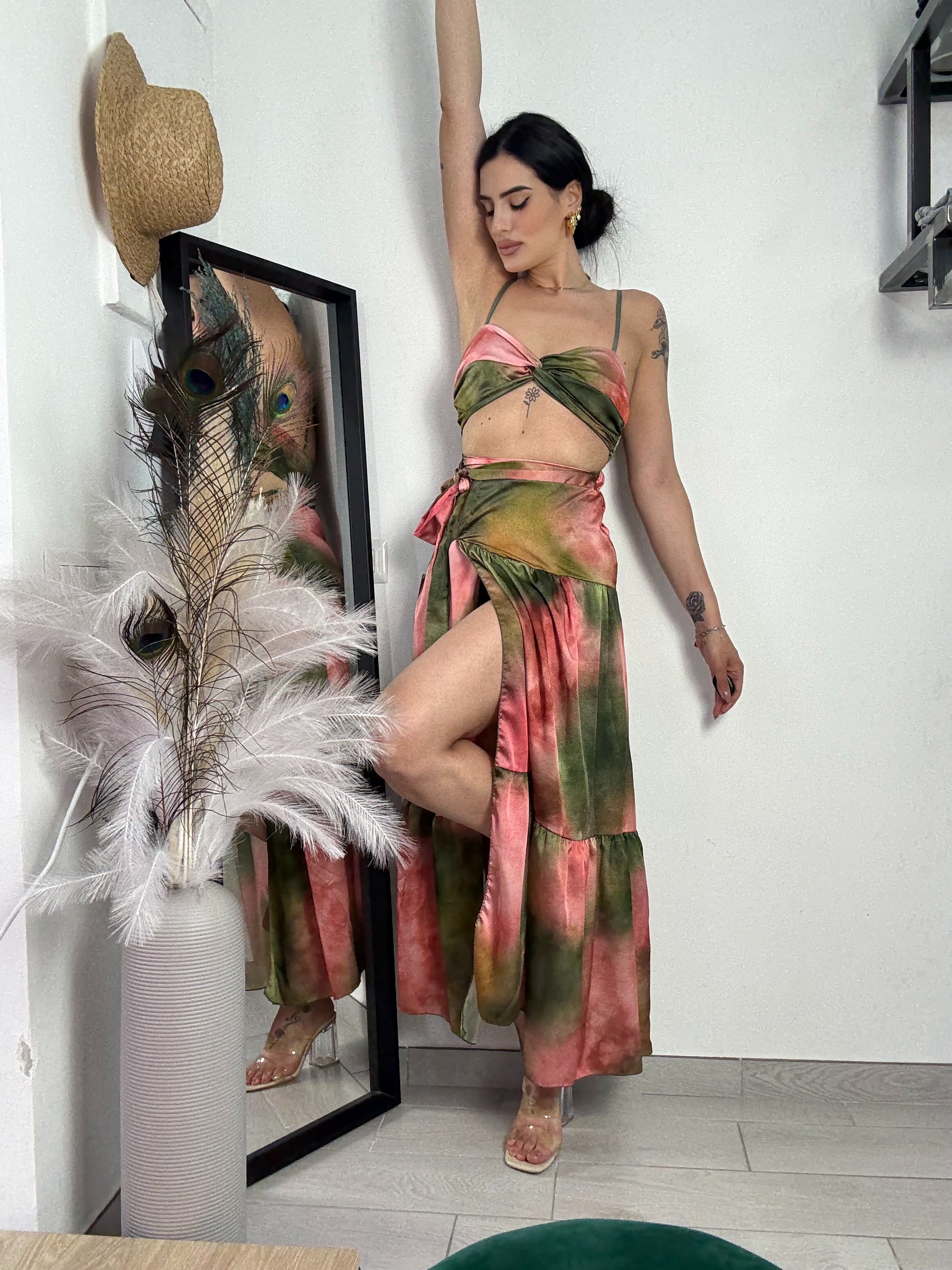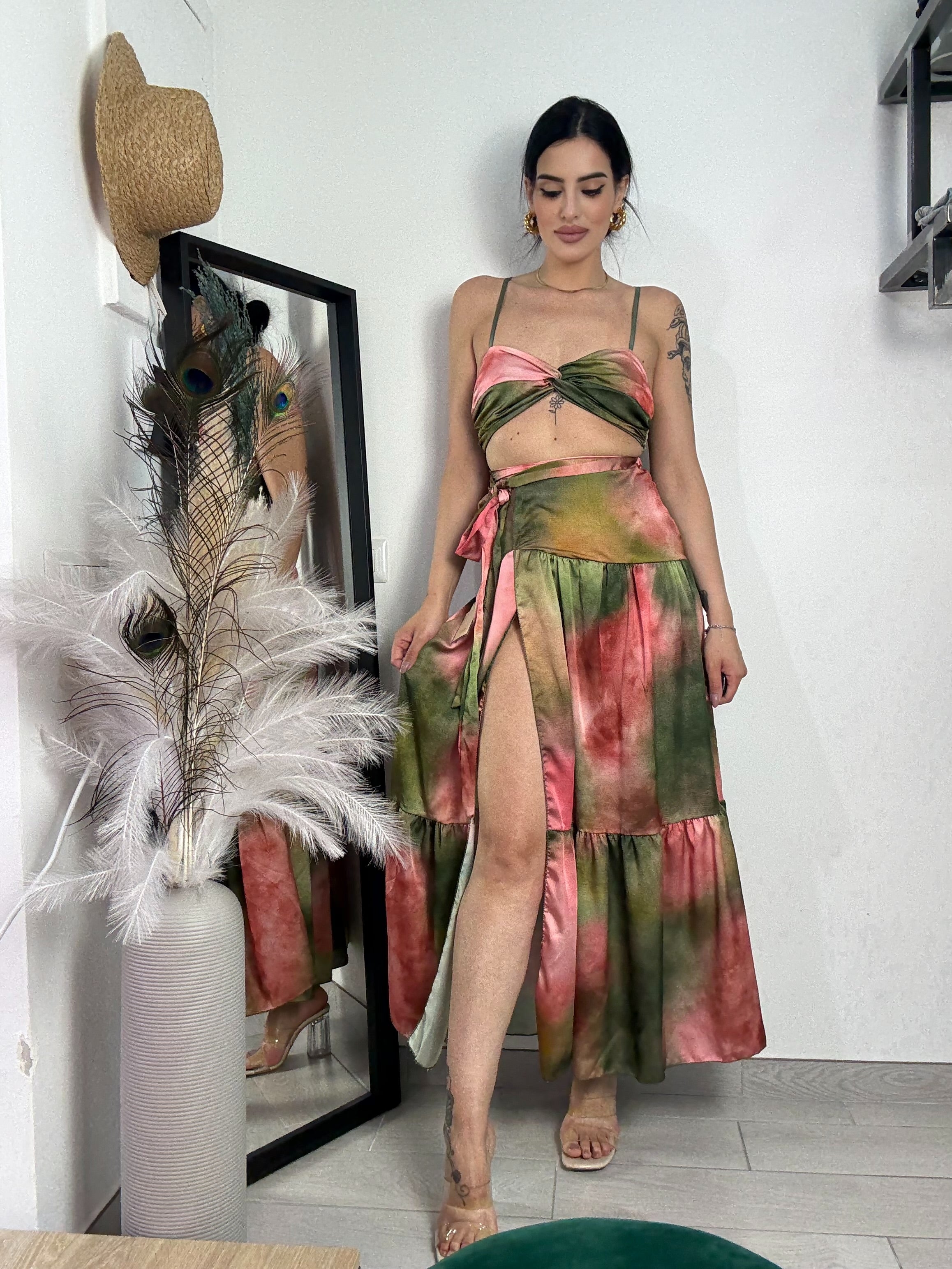 Due pezzi , fascia con elastico tubolare sul retro e bretelle regolabili , e gonna con elastico in vita e spacco avanti , taglia unica vestibilità consigliata da una s ad una L