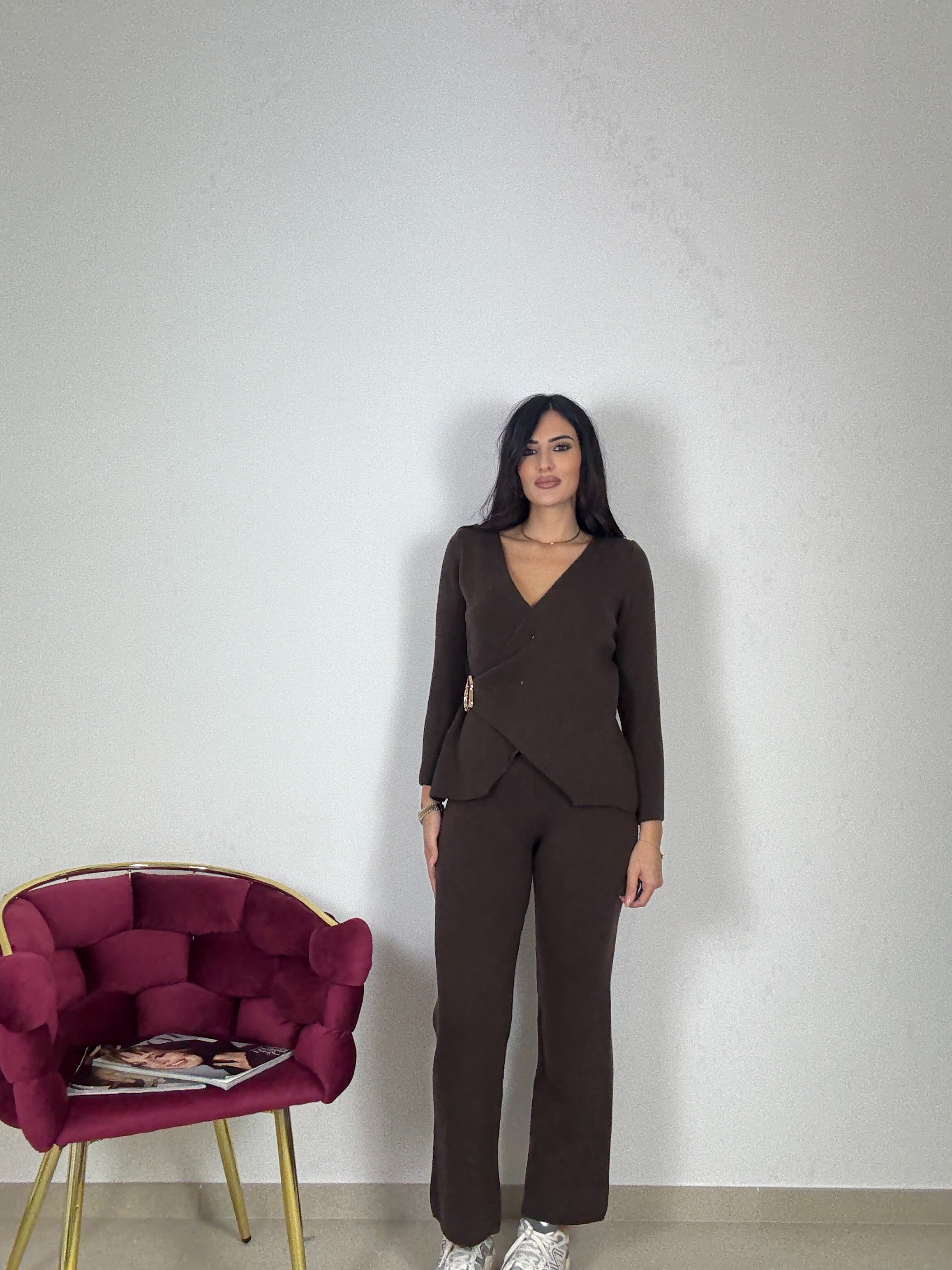 Coordinato in lanetta caldo , comodo e morbido, taglia unica elasticizzato, pantalone con molla in vita , maglia scollo a V e dettaglio in oro , vestibilità consigliata da una S ad una L