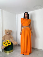 Vi arriveranno a casa due pezzi , top con spallina preformata, gonna lunga con spacco a lato , e molla In vita, taglia unica vestibilità consigliata da una S ad una L