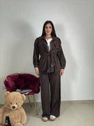 Vi arriveranno a casa due pezzi giacca/camicia con cintura in vita regolabile , e panatalone palazzo elastico in vita , taglia unica vestibilità consigliata da una S ad una L