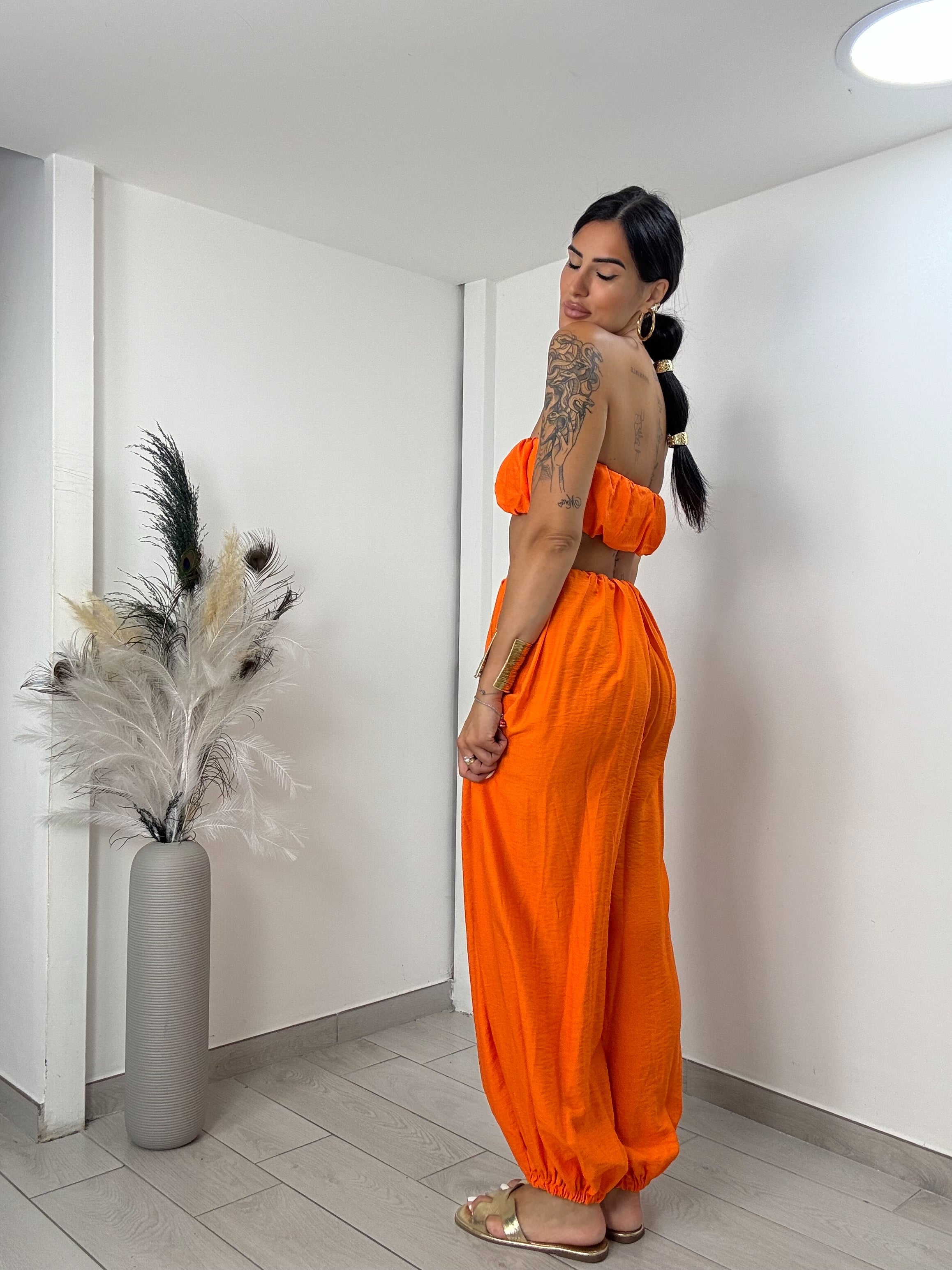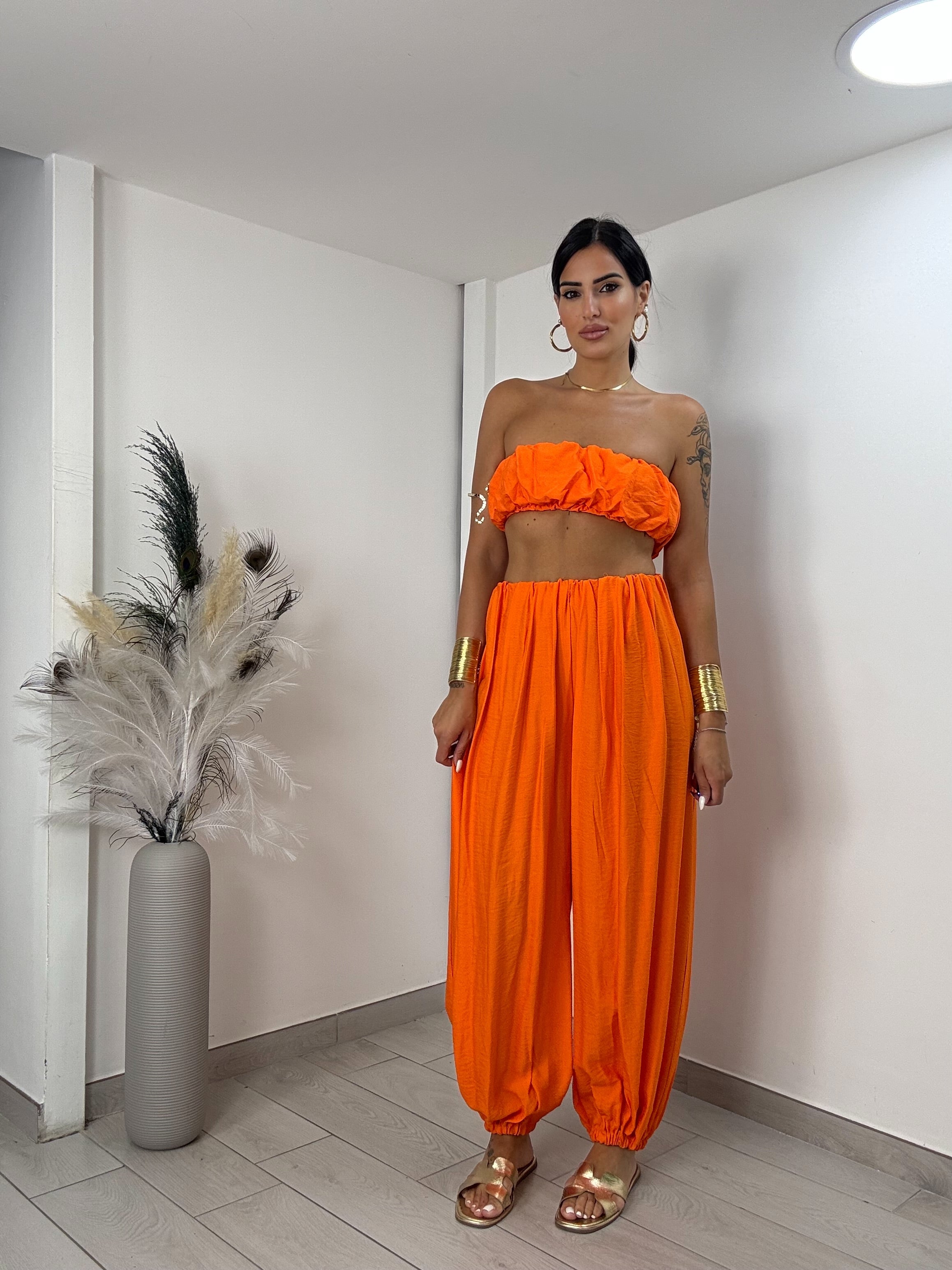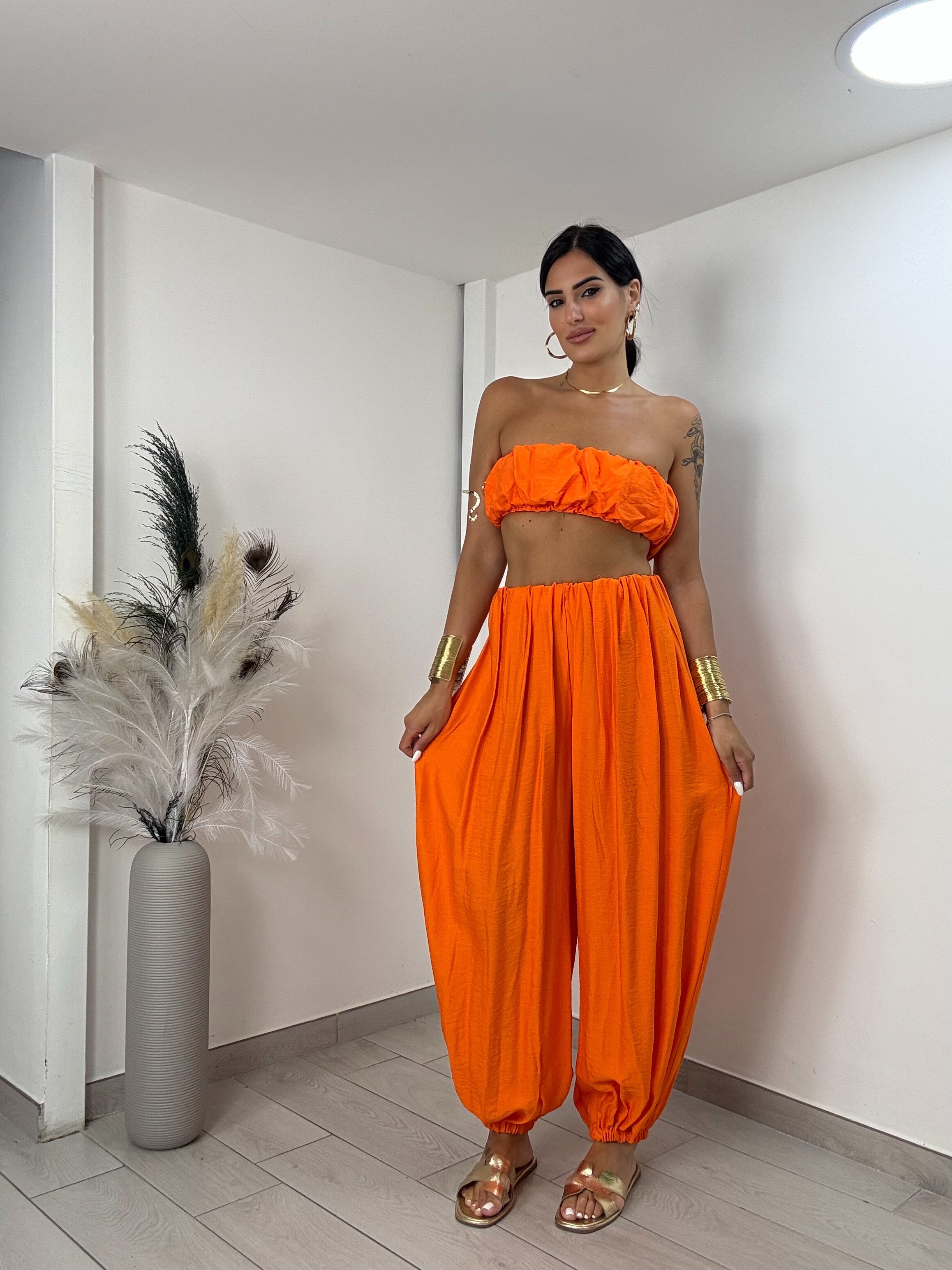 Vi arriveranno a casa due pezzi , top a fascia e pantalone ballons , con elastico in vita e molla alle caviglie , taglia unica vestibilità consigliata da una S ad una L