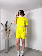Vi arriveranno a casa due pezzi , t-shirt modello over , che potete tranquillamente renderla più corta mettendola  al interno del pantaloncino, pantaloncino lunghezza regolare , elastico in vita, e tasche invisibili . Taglia unica Vestibilità consigliata da una s ad una XL