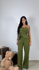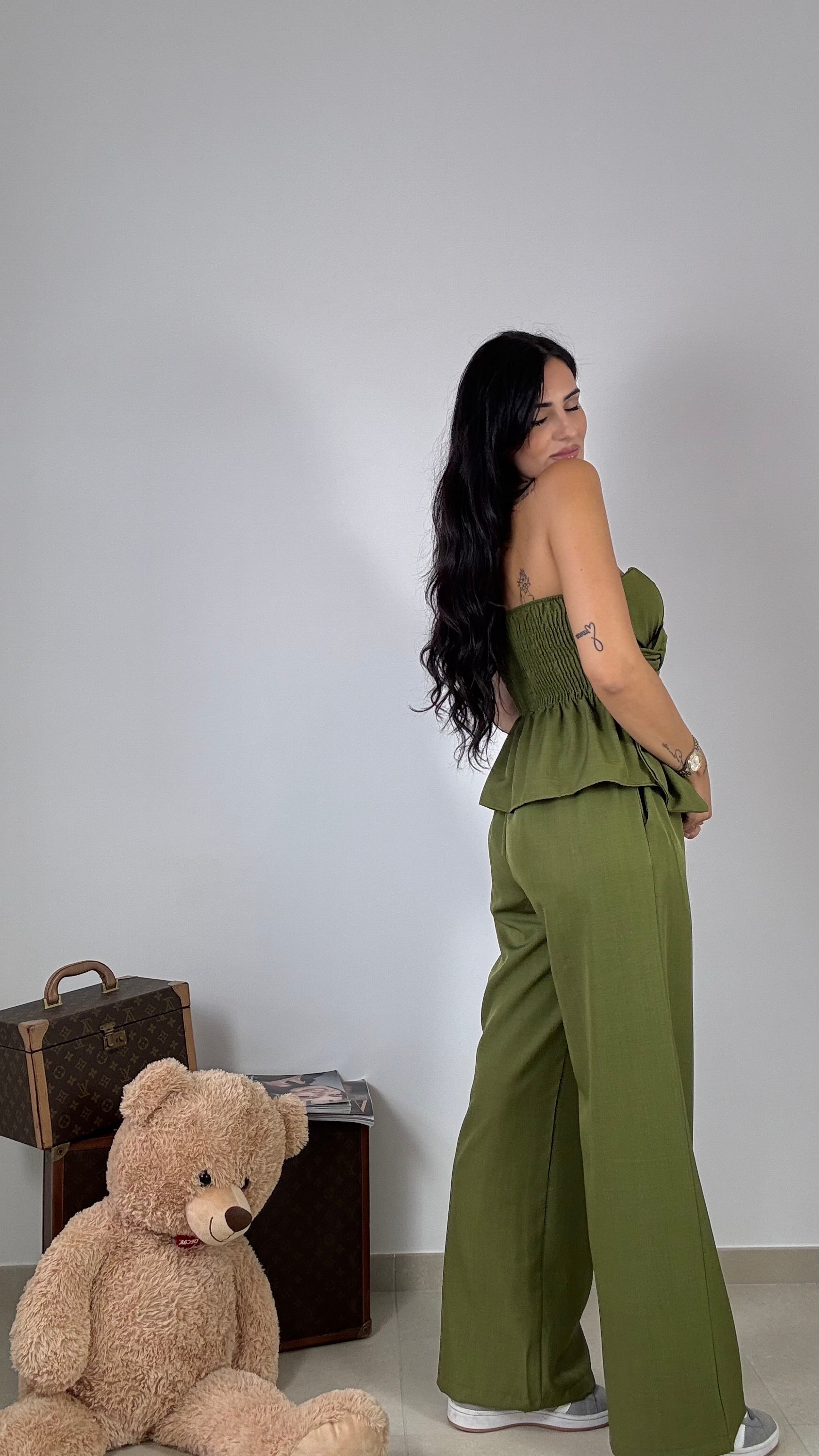 Vi arriveranno a casa due pezzi , top a fascia , con elastico tubolare sul retro , e pantalone palazzo con elastico in vita , taglia unica vestibilità consigliata da una S ad una L