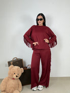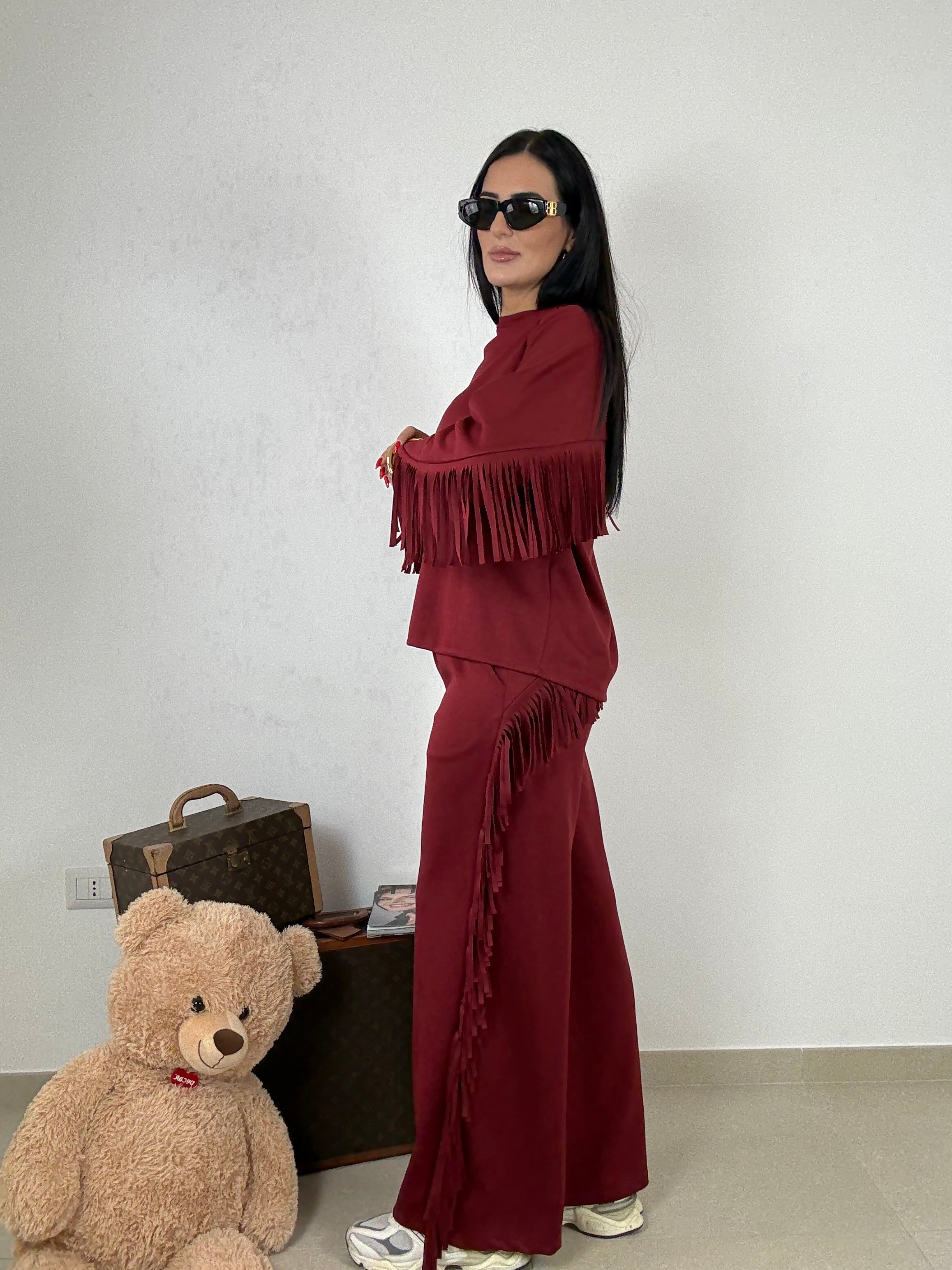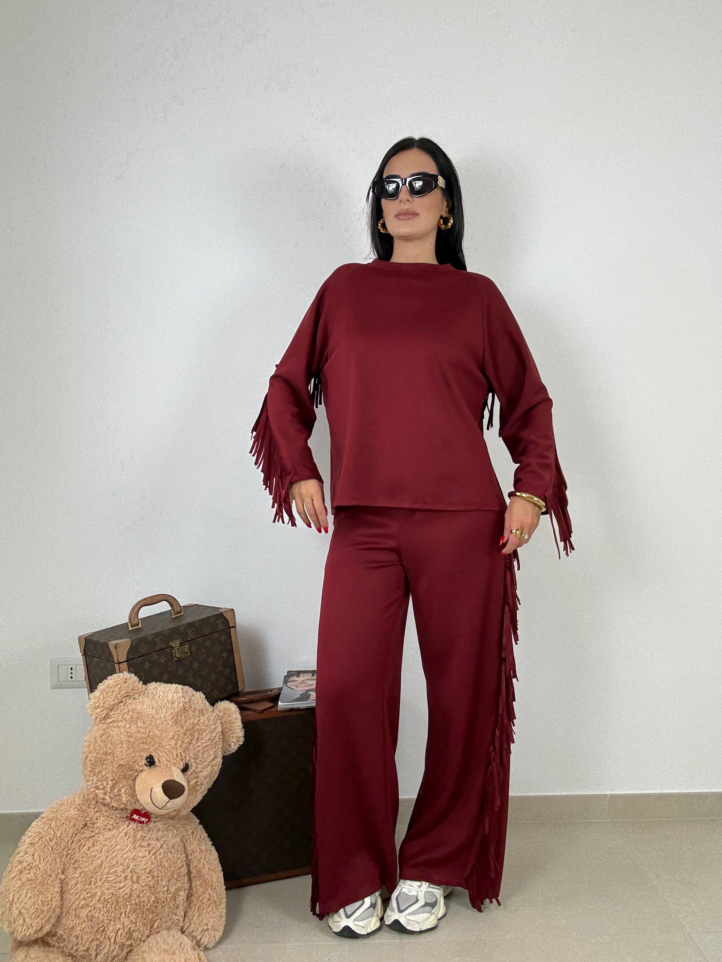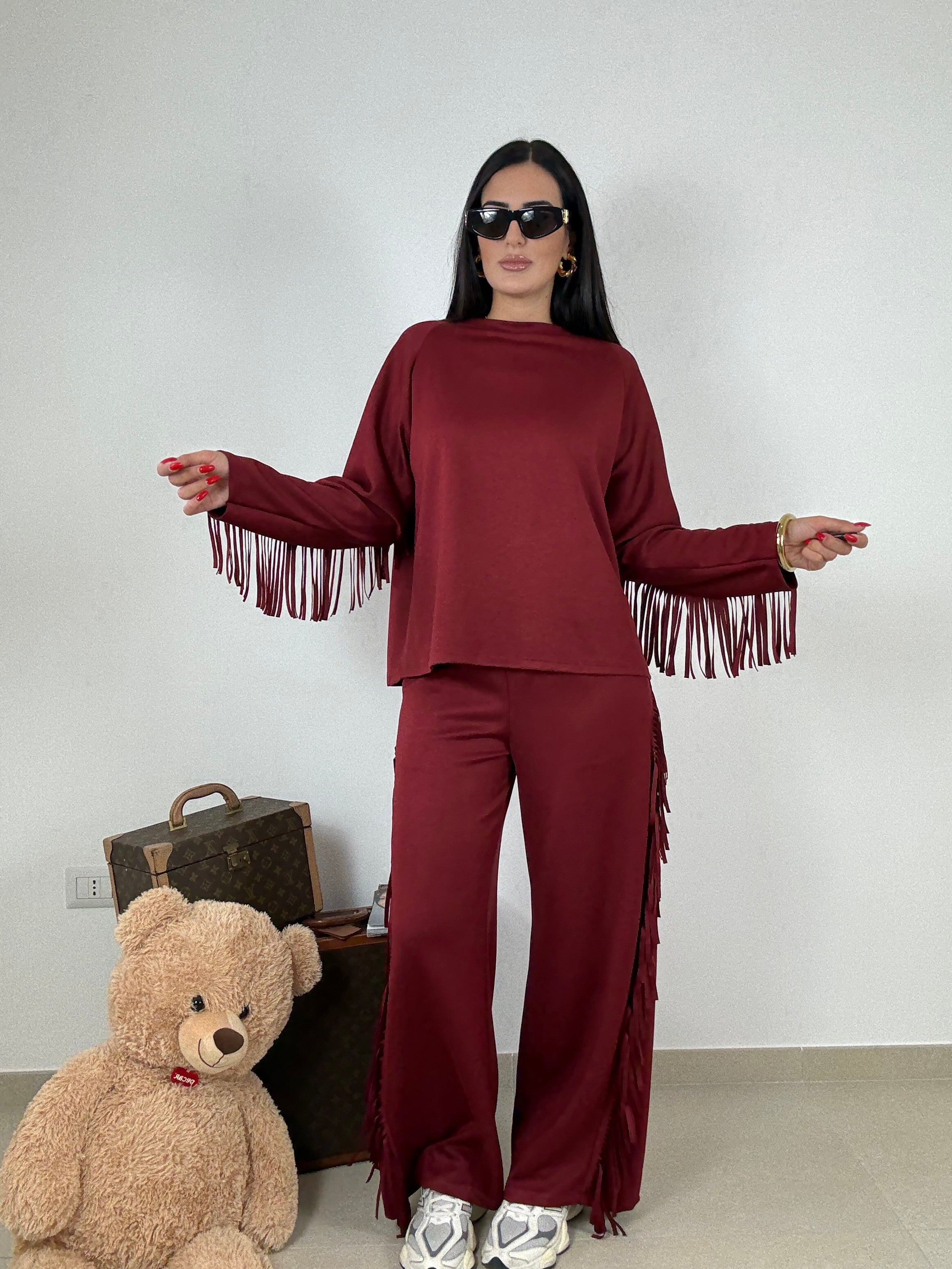 Tuta , vi arriveranno a casa due pezzi , felpa con frange alle maniche e pantalone con molla in vita ,e frange ai lati , taglia unica vestibilità consigliata da una S ad una L