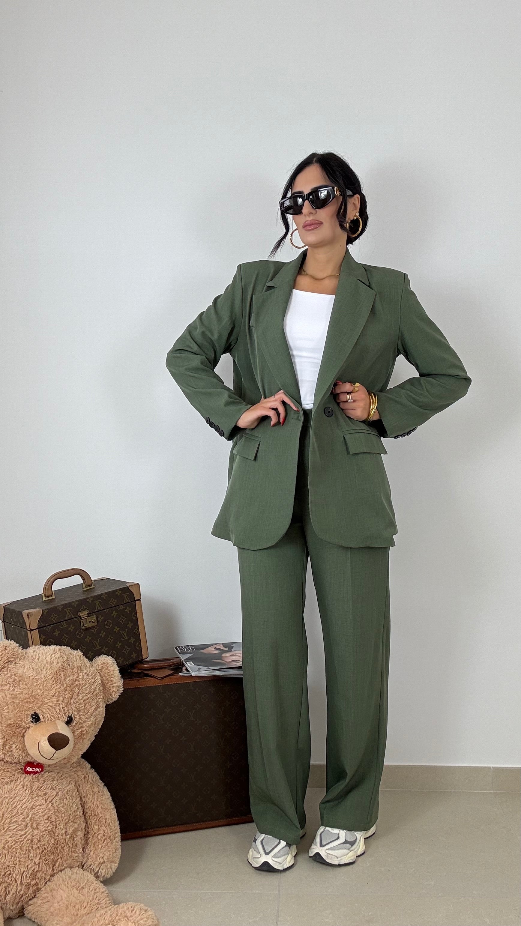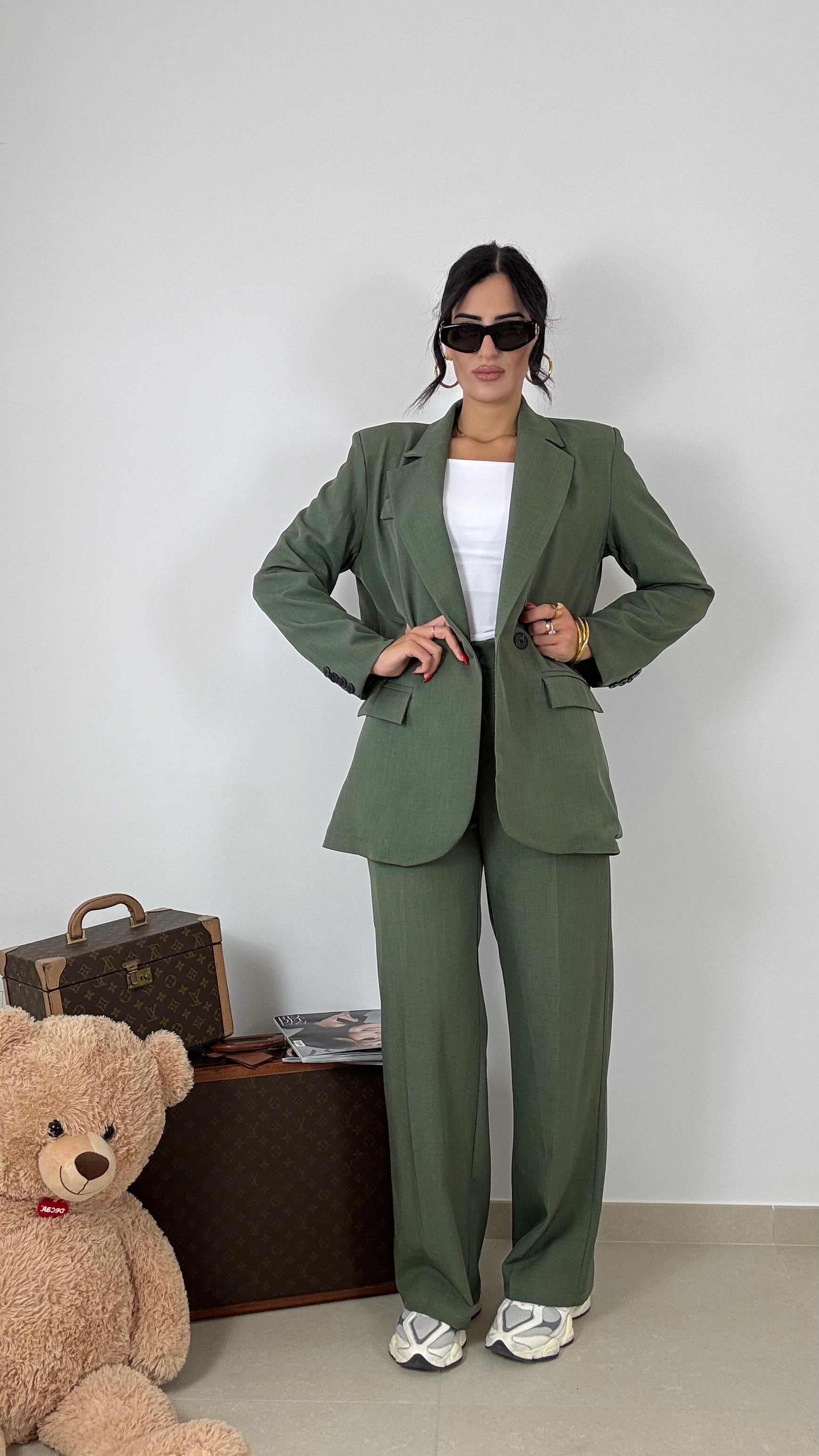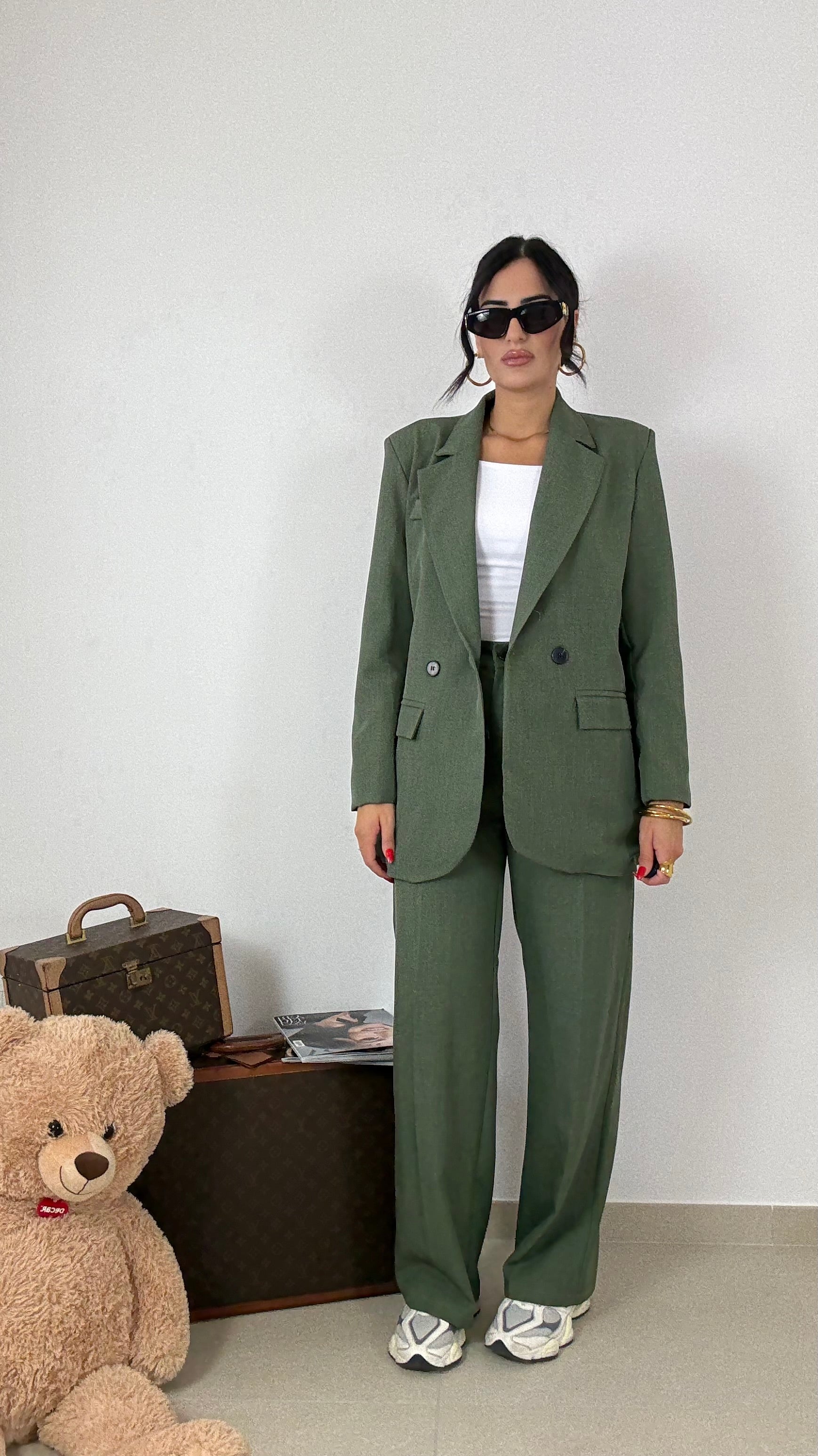 Tailleur giacca chiusura doppio petto , spalline preformata , pantalone a palazzo tasche taglio America , chiusura con zip e bottone , e molla sul retro , taglia unica vestibilità consigliata da una S ad una L