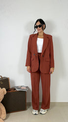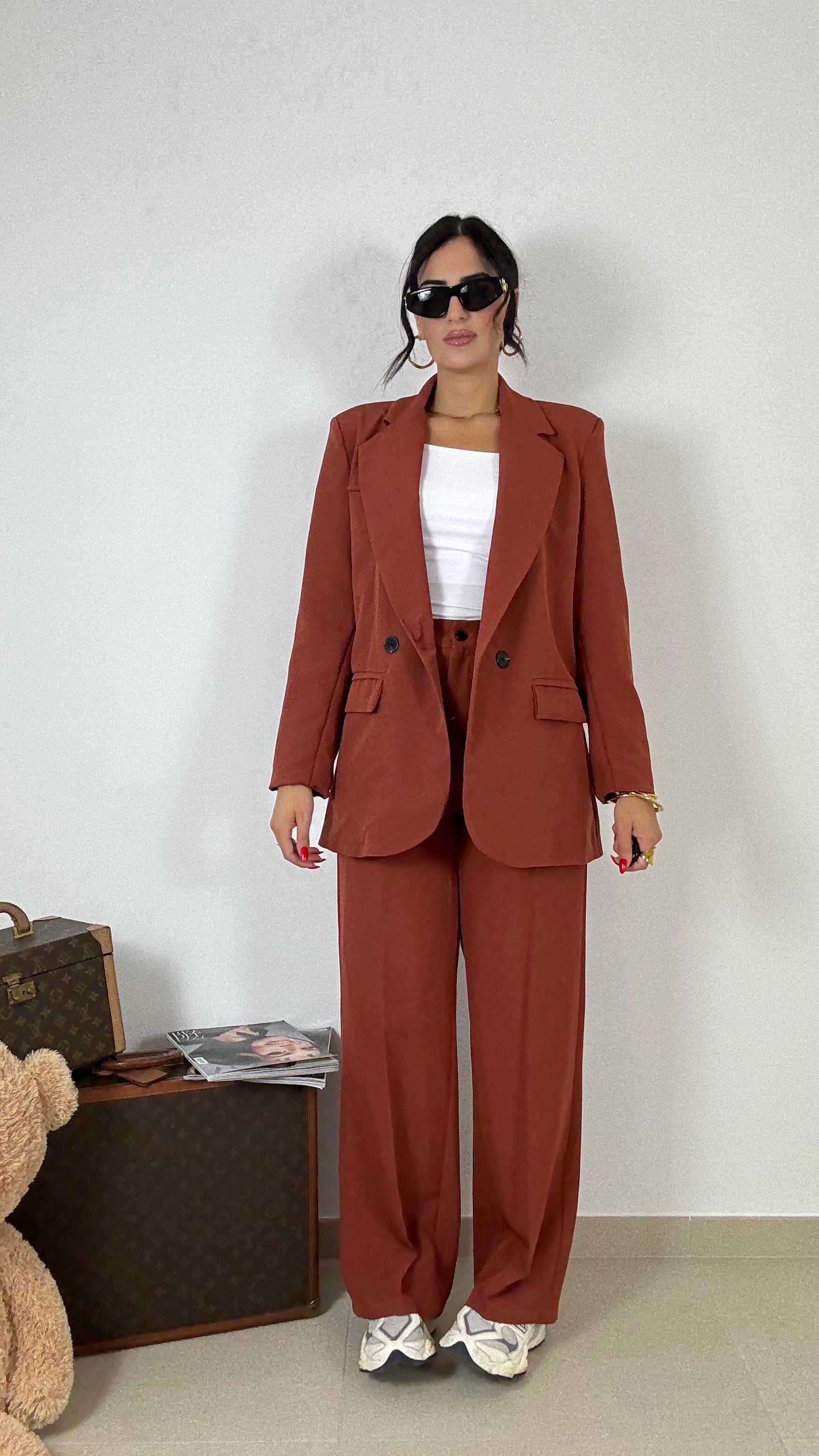Tailleur giacca chiusura doppio petto , spalline preformata , pantalone a palazzo tasche taglio America , chiusura con zip e bottone , e molla sul retro , taglia unica vestibilità consigliata da una S ad una L