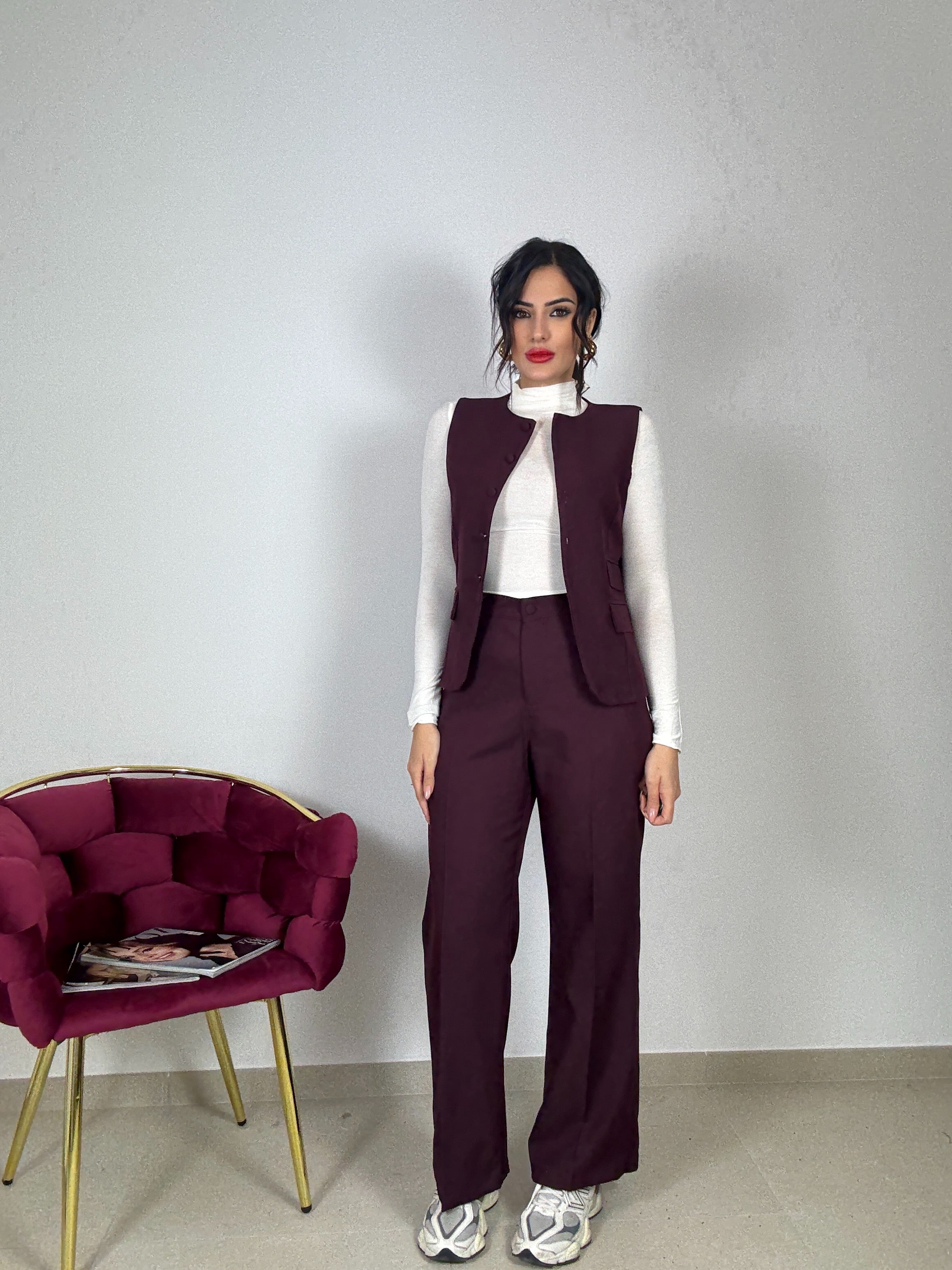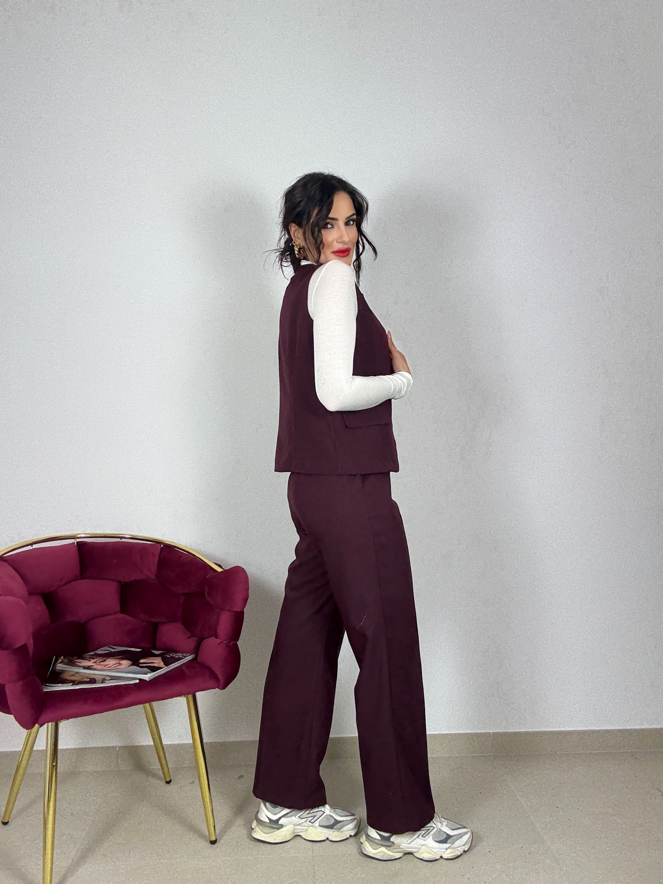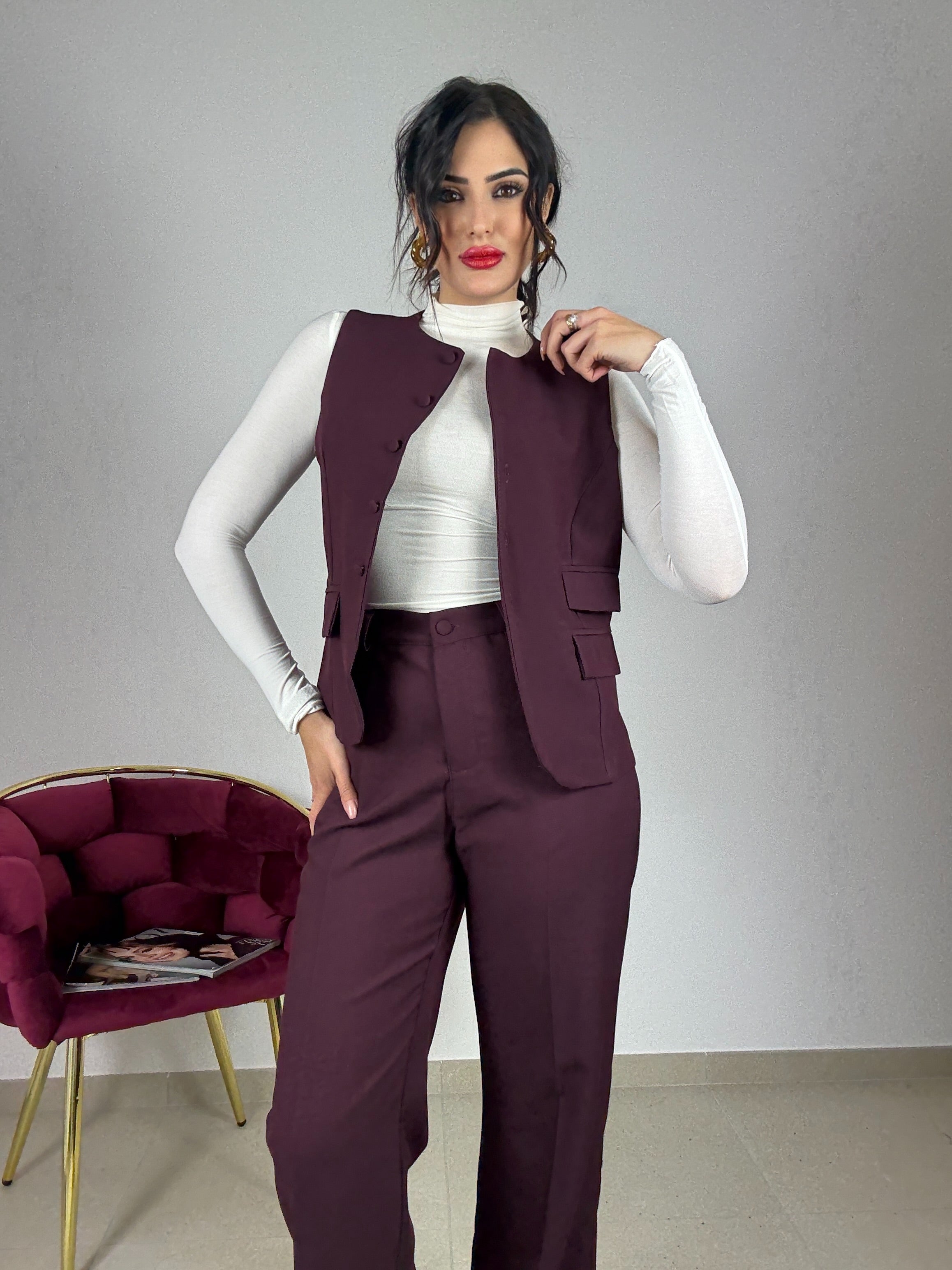 Tailleur , in versione invernale , caldo , gilet con chiusura con i bottoncini, e finte tasche , pantalone gamba dritta , con elastico in vita sul retro , taglia unica vestibilità consigliata da una S ad una L