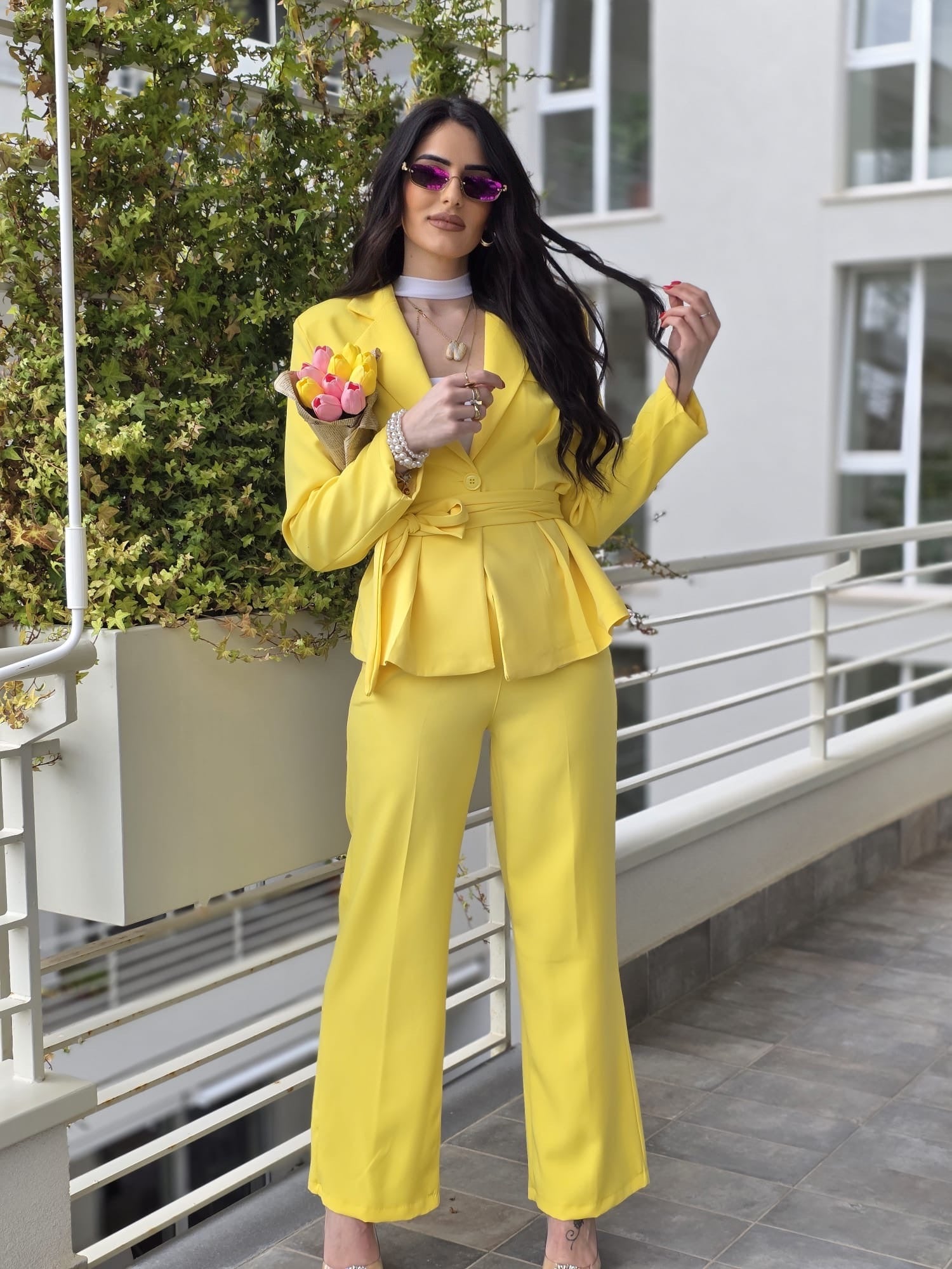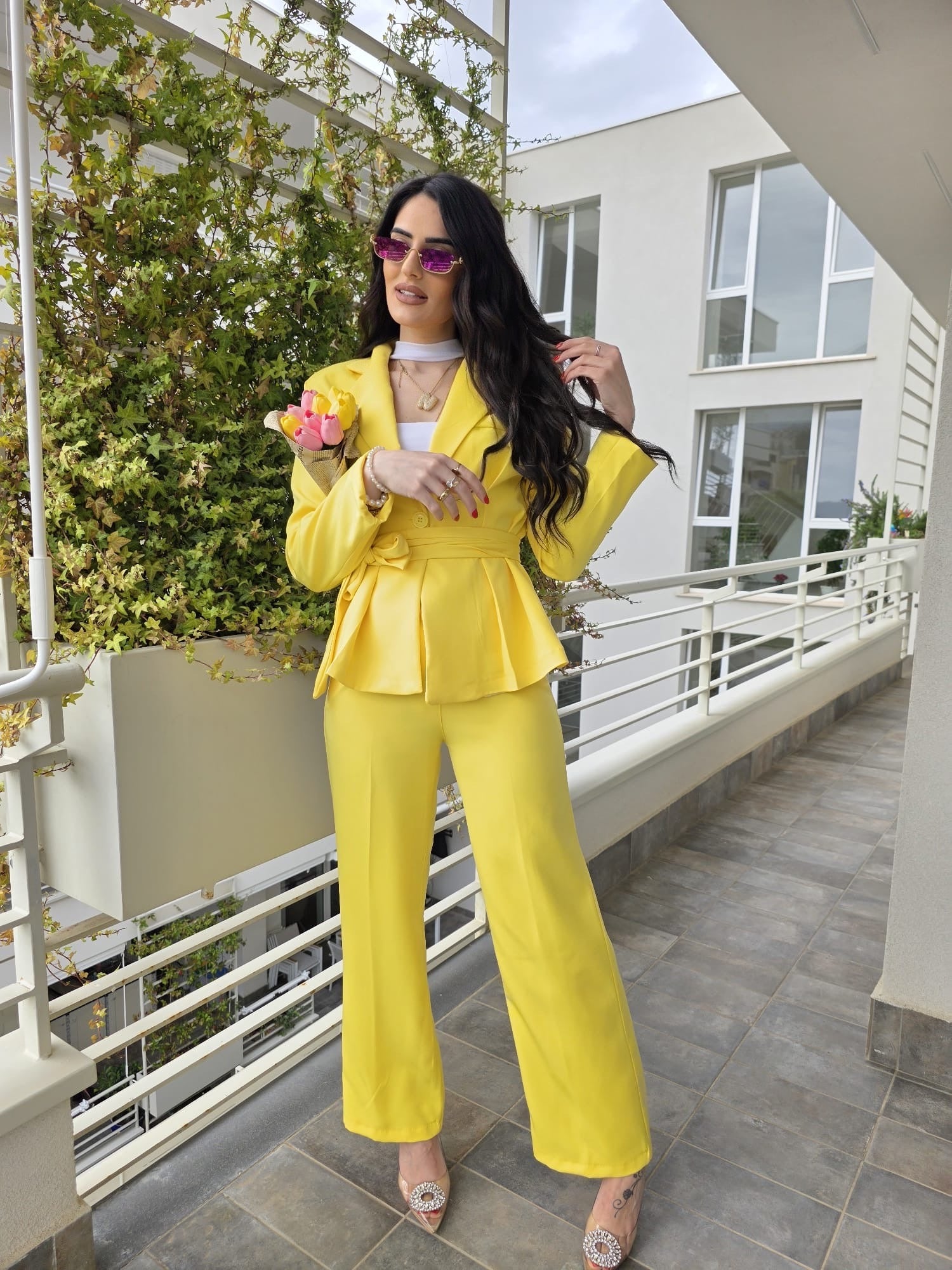 Vi arriveranno a casa due pezzi , giacca modello regular con spachetti avanti , chiusura con bottone , e coulisse in vita removibile , pantalone palazzo con molla in vita e chiusura con bottone , taglia unica Vestibilità consigliata da una s ad una L