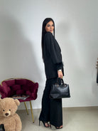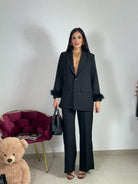 Vi arriveranno a casa due pezzi giacca , chiusura con doppio bottone , piume vicino alle maniche , Pantalone palazzo , chiusura con zip e bottone , e molla in vita sul retro , taglia unica vestibilità consigliata da una S ad una L