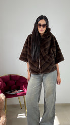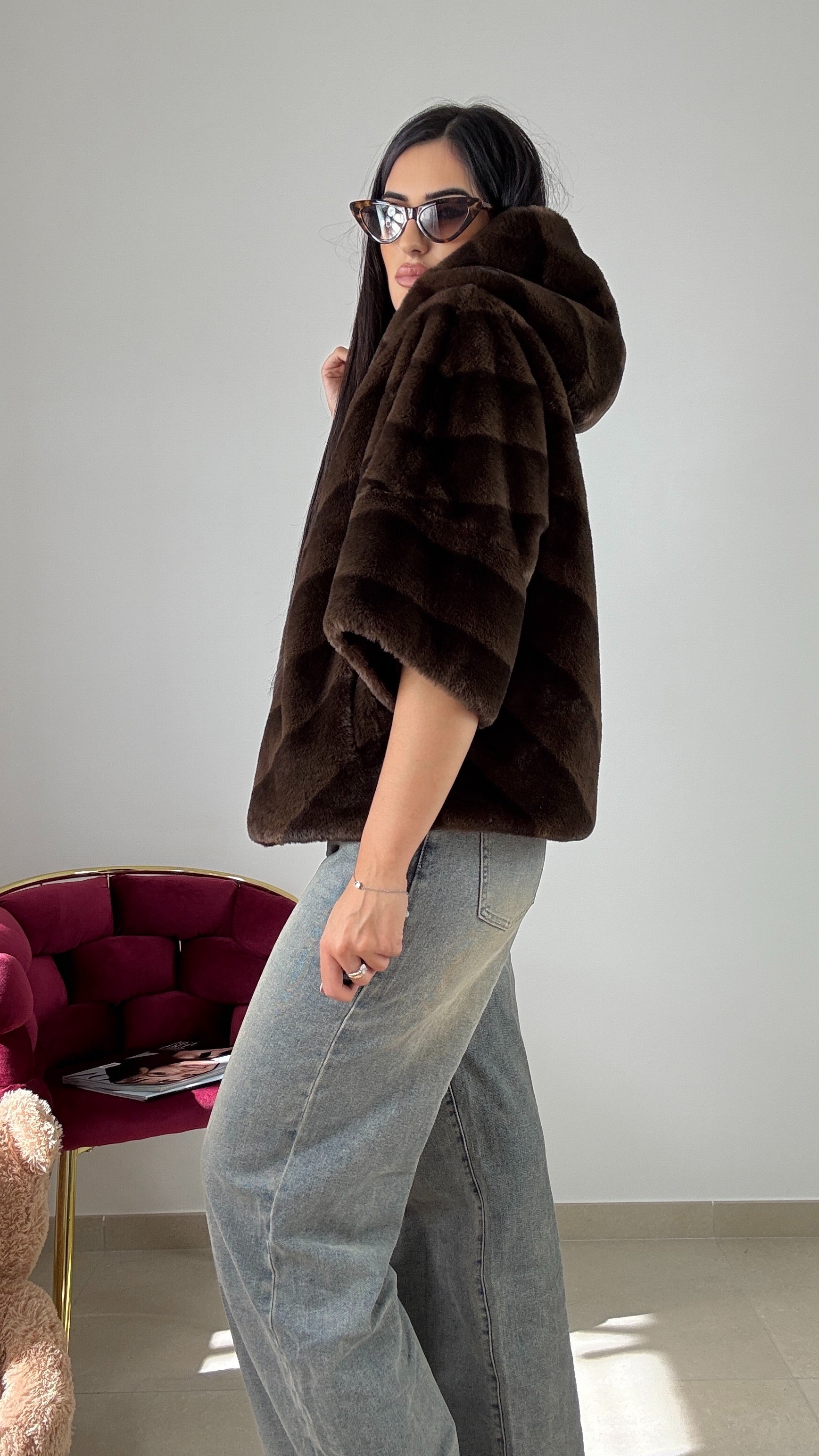 Eco-fur ,con cappuccio , con zip , taglia unica vestibilità consigliata da una S ad una L