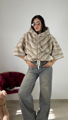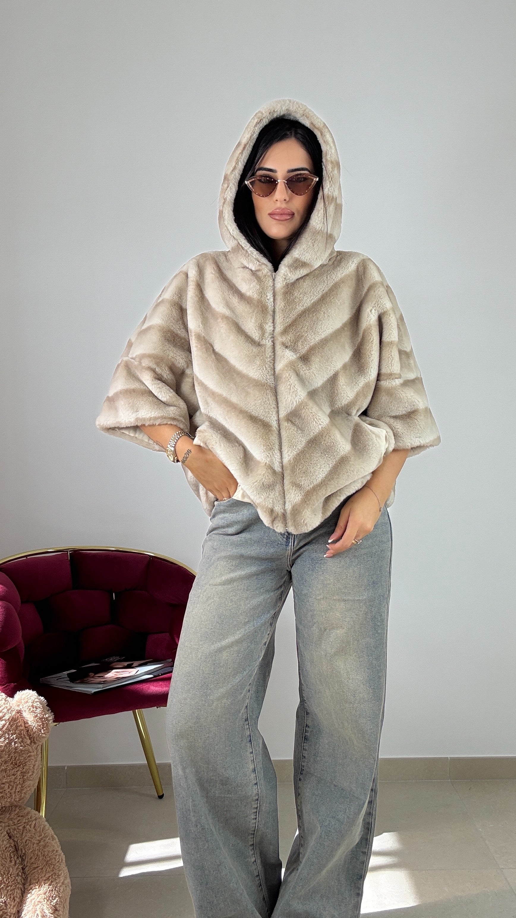 Eco-fur ,con cappuccio , con zip , taglia unica vestibilità consigliata da una S ad una L