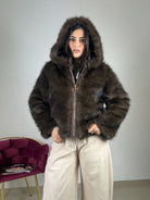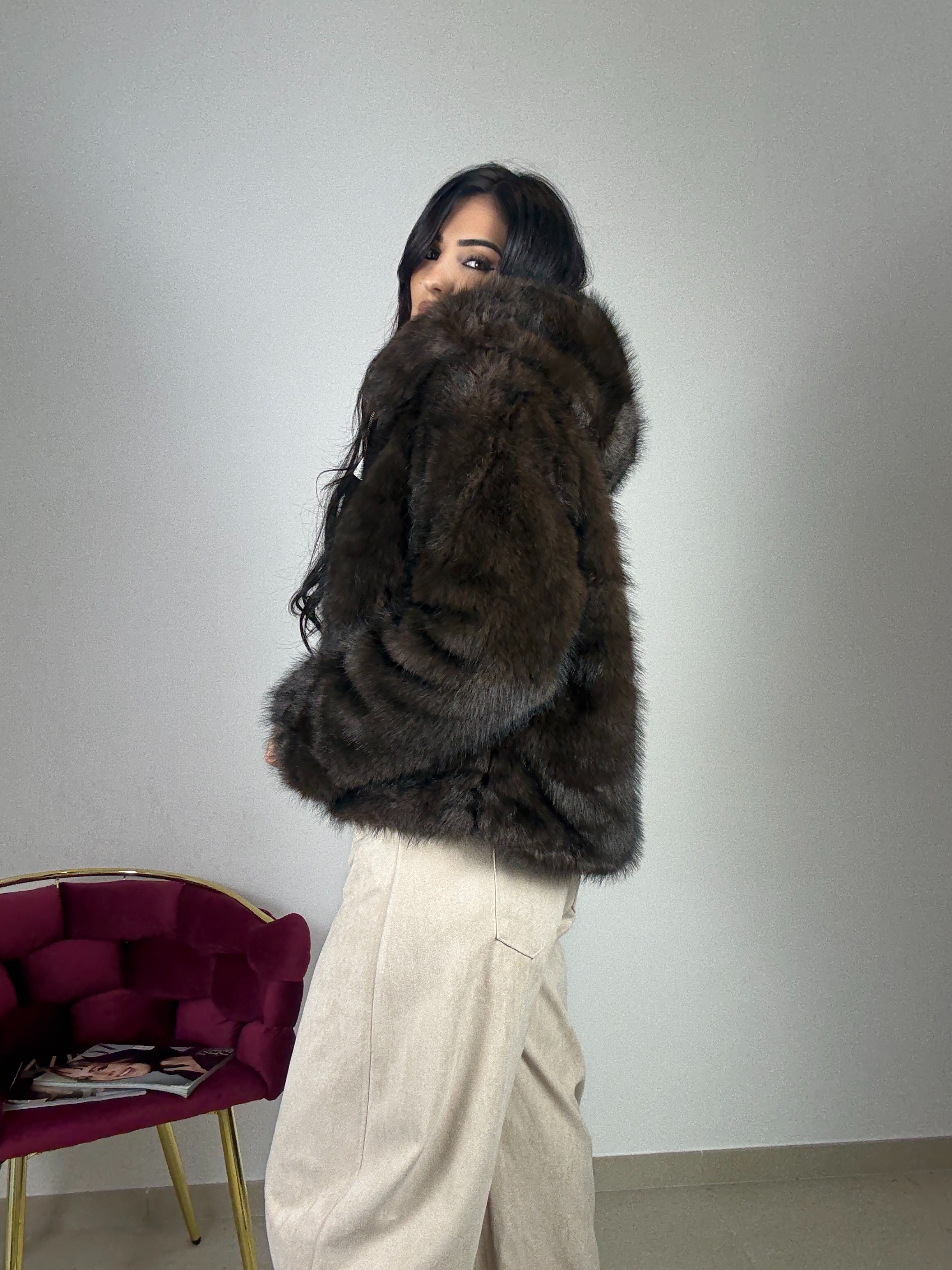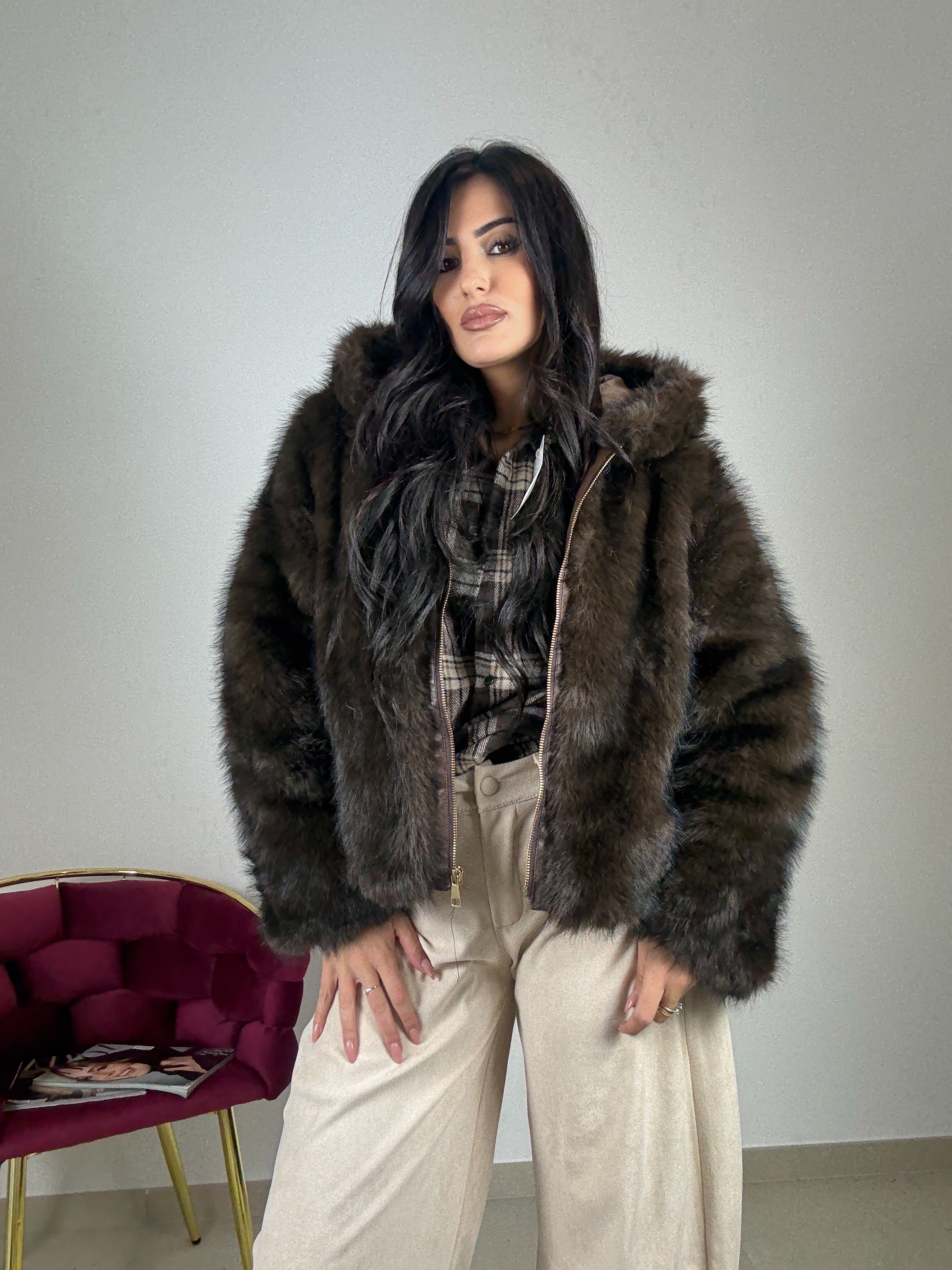 Eco-fur , top quality con cappuccio , chiusura con zip , taglia unica vestibilità consigliata da una S ad una L