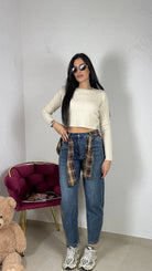 Jeans modello ballons , elasticizzato , vita alta , con foulard in vita removibile , vestibilità regolare