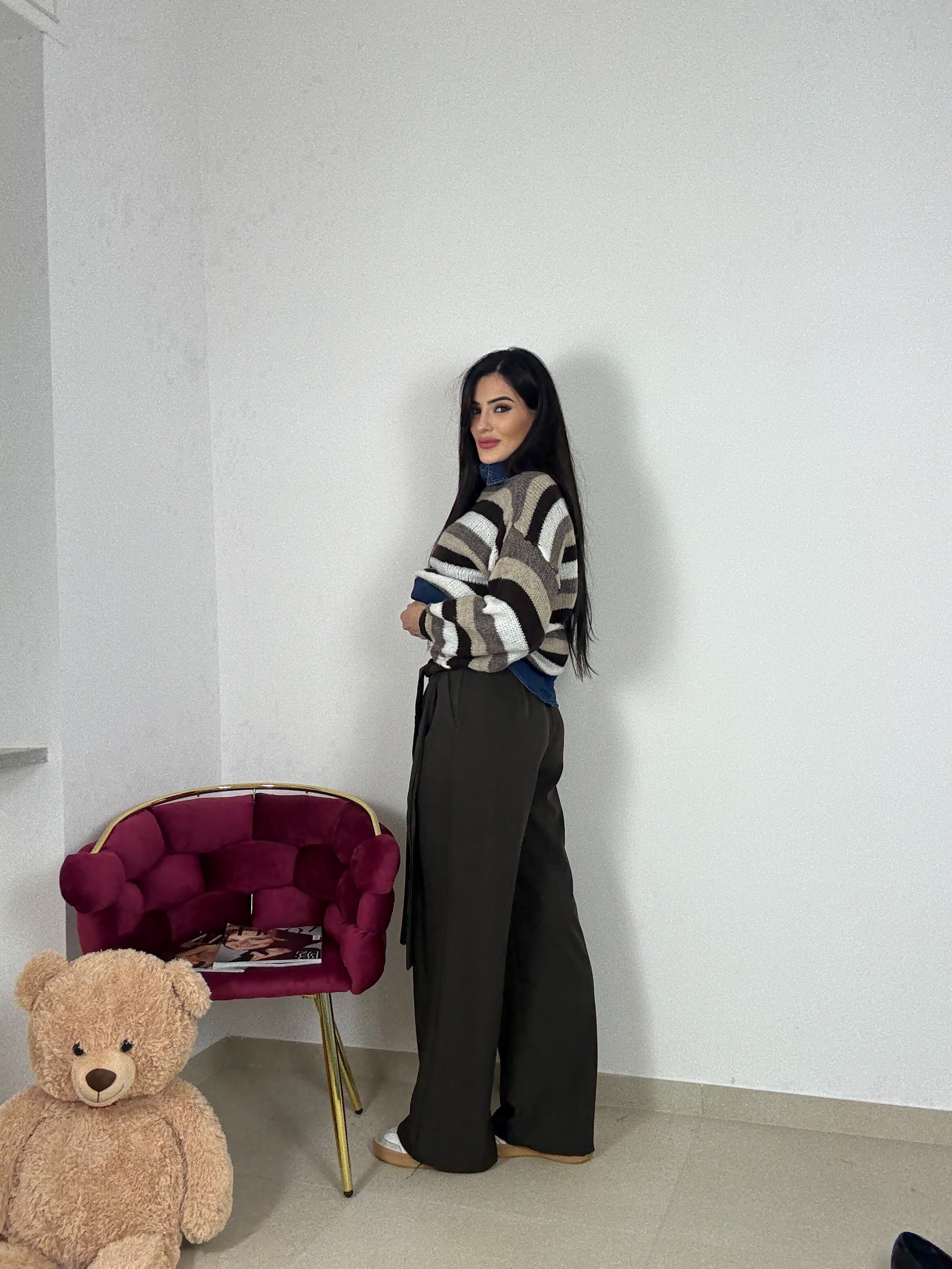 Pantalone a palazzo , chiusura con zip e bottone , molla in vita sul retro , fusciacca a lato , taglia unica vestibilità consigliata da una S ad una L
