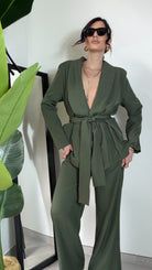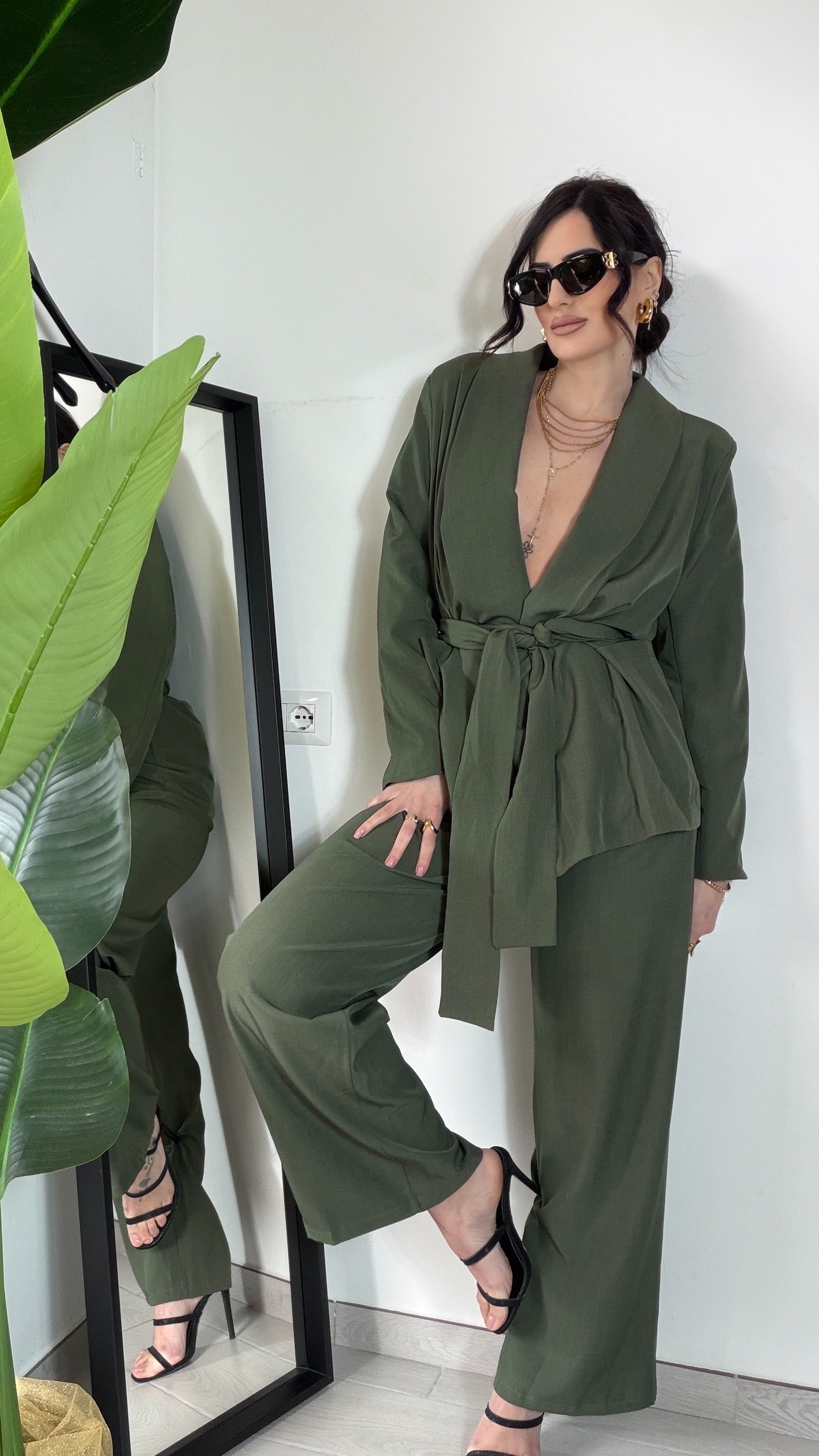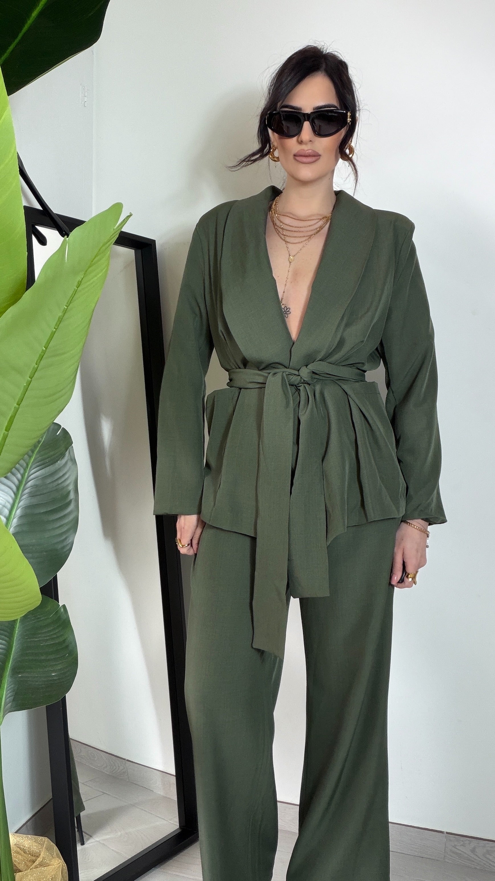 tailleur, giacca con coulisse in vita , pantalone a palazzo , molla in vita sul retro , chiusura con zip e bottone , taglia unica vestibilità consigliata da una S ad una L