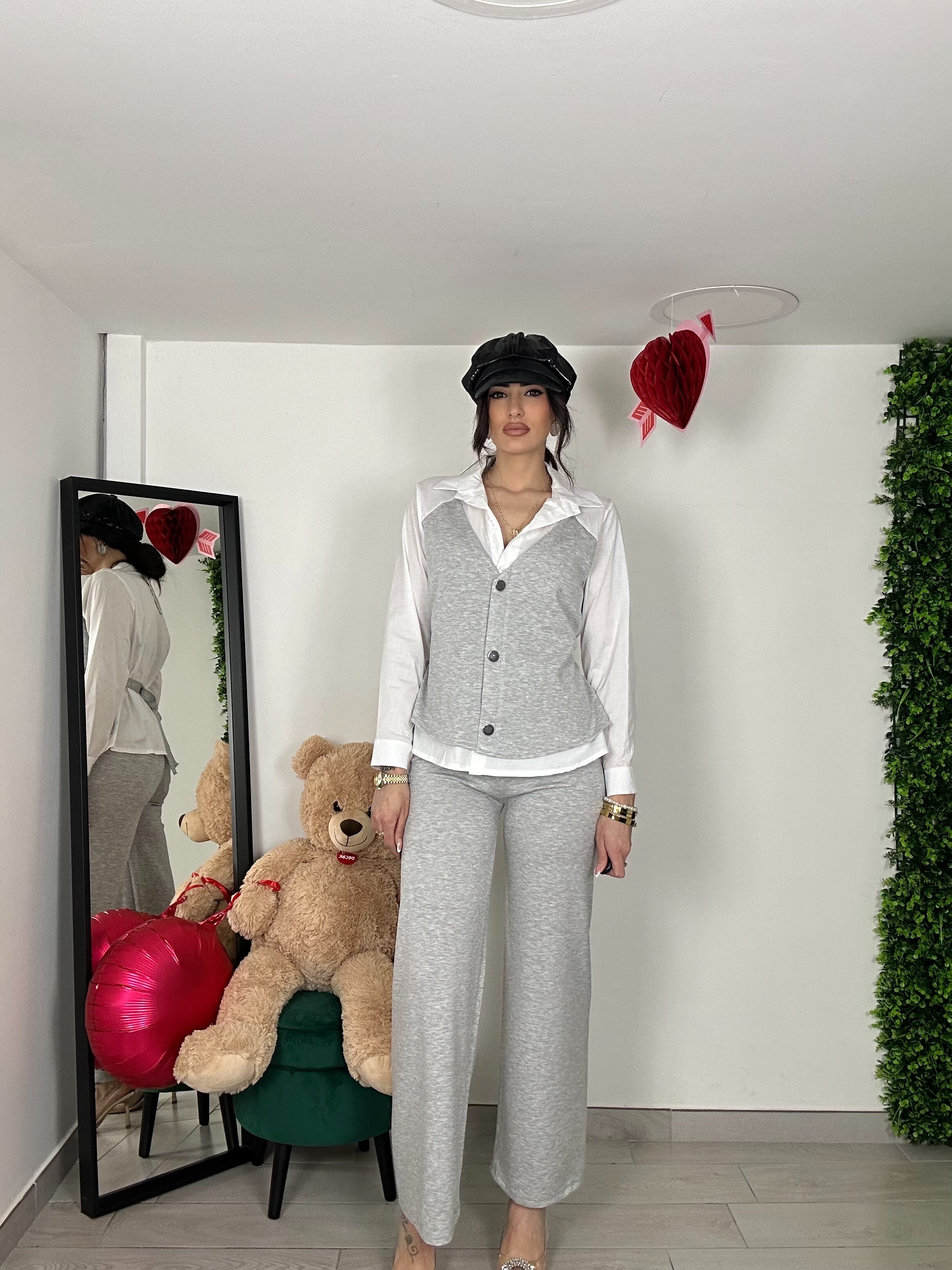 Vi arriveranno a casa , due pezzi , camicia compreso di gilet , non removibile , e pantalone palazzo con elastico in vita , taglia unica Vestibilità consigliata da una s ad una L