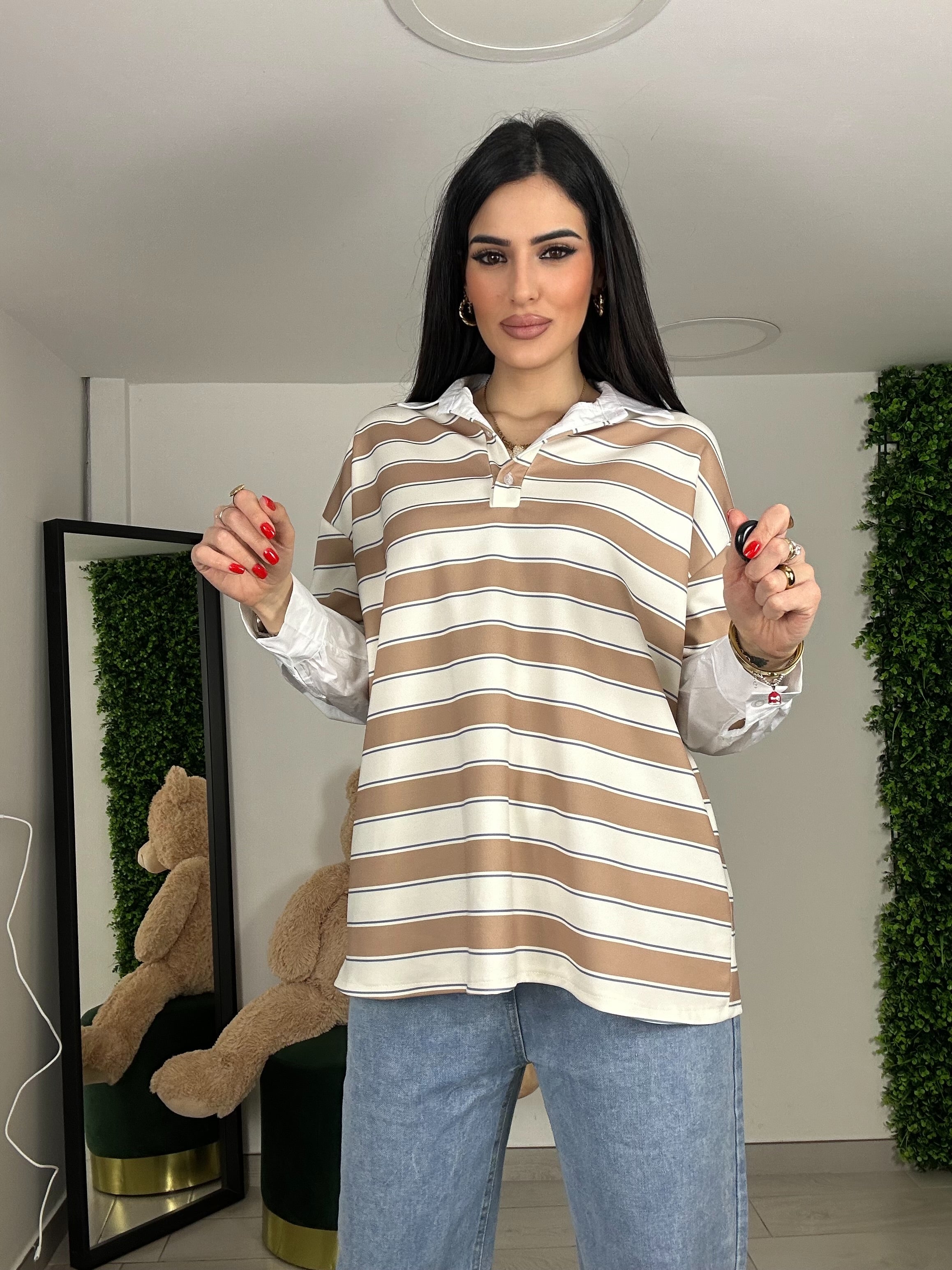 Maglia con collo e manica camicia , sembrano due pezzi ma in realtà è un unico pezzo , modello over , taglia unica Vestibilità consigliata da una s ad una XL